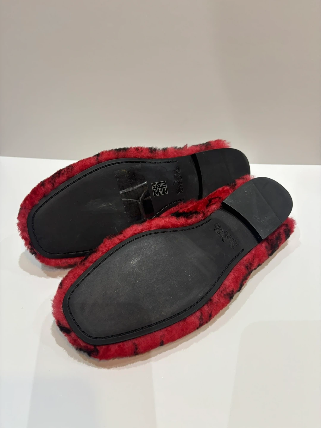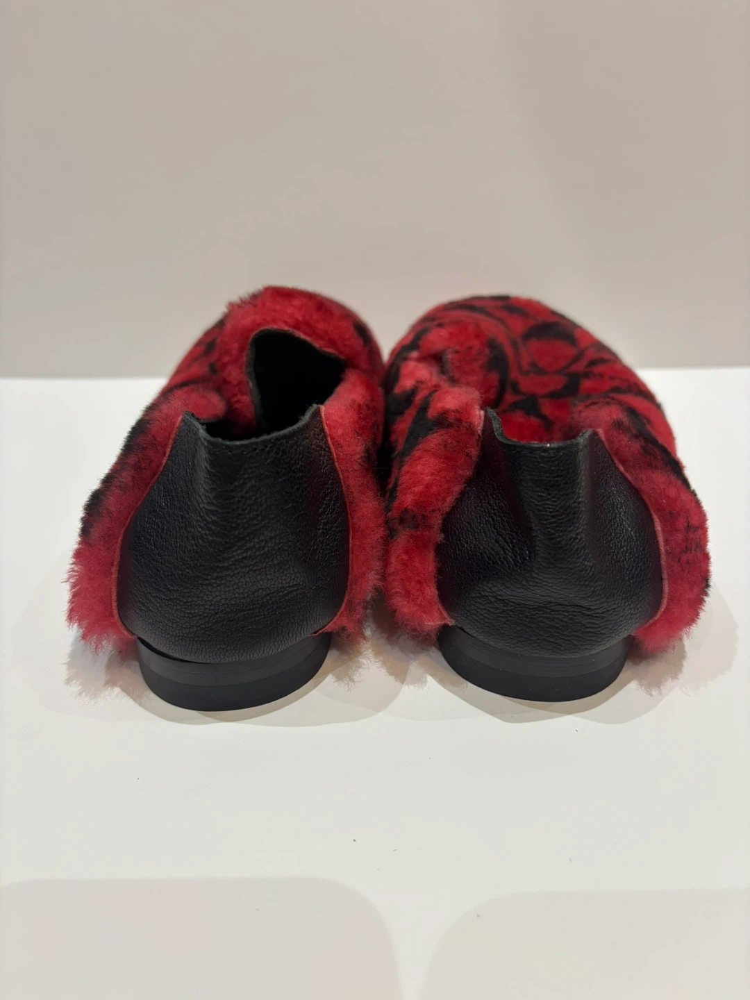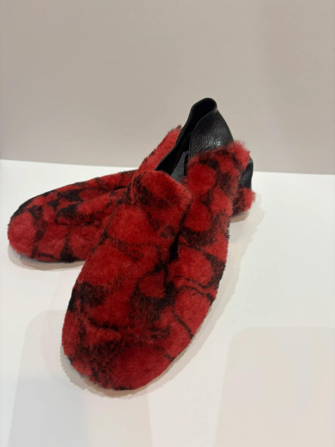 Cozy red and black fuzzy slippers. Perfect for lounging.