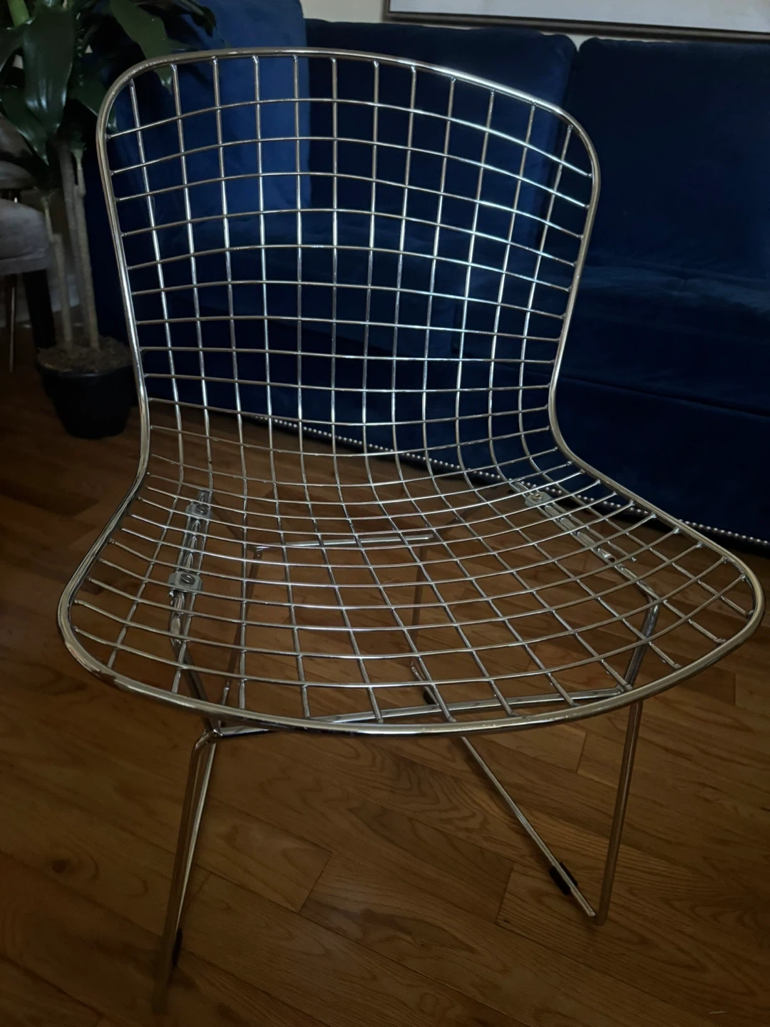 Selling a Bertoia style wire chair. It's in great condition and would look great in any home! The chair features a chrome finish with a white seat pad.