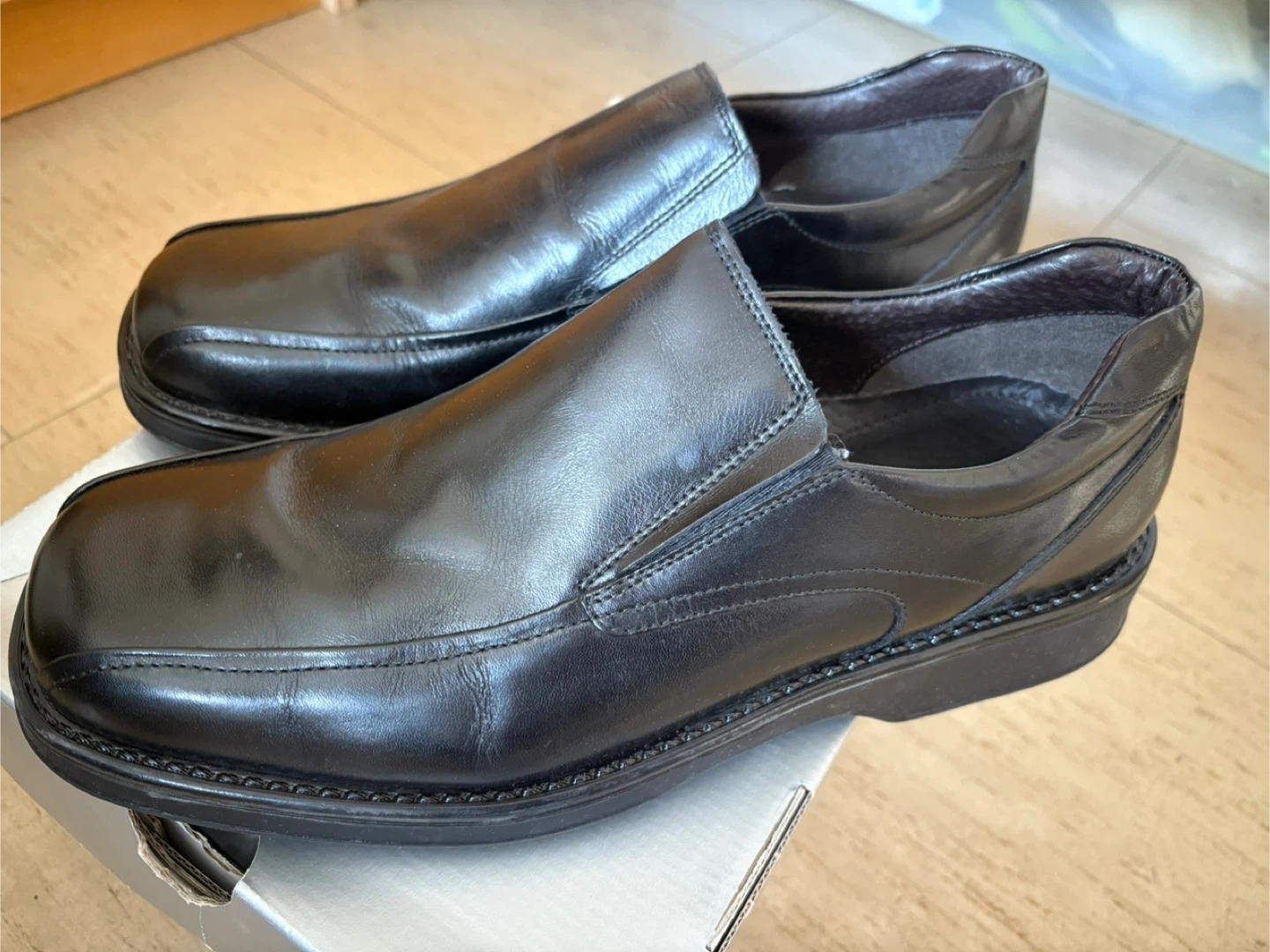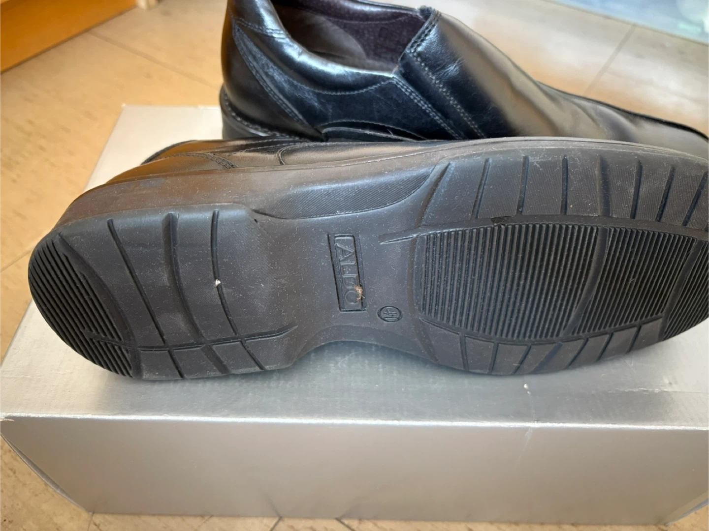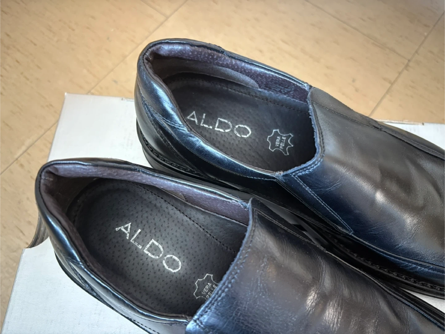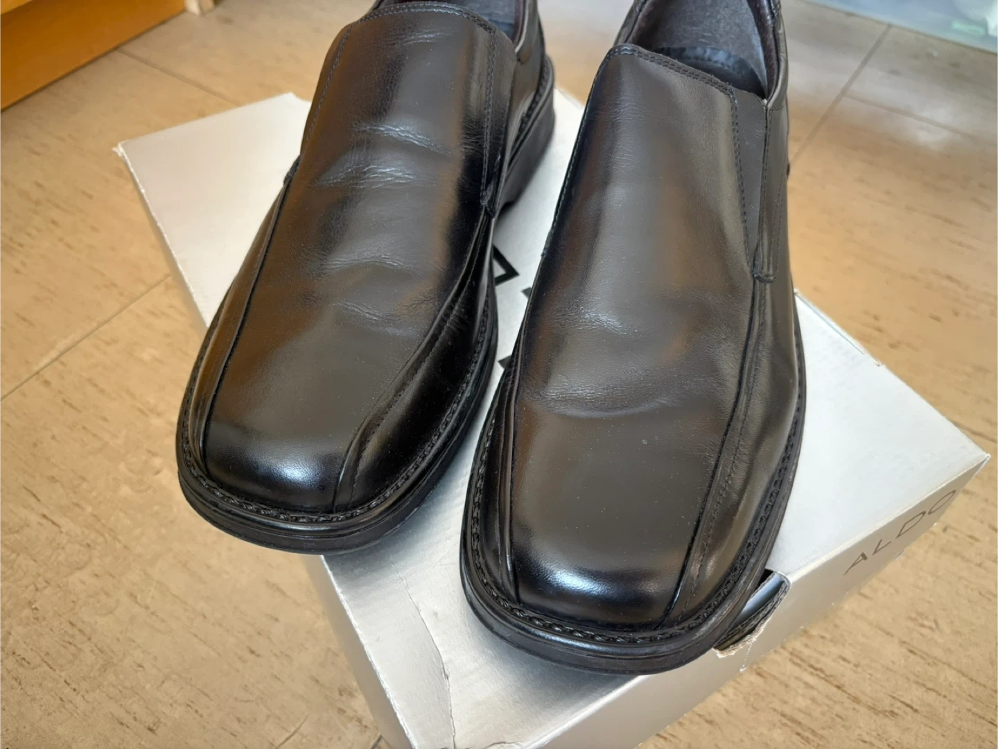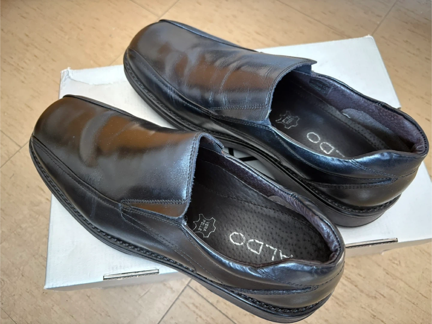 These are a pair of ALDO black leather loafers. They come with the original box. Great for a business casual look!