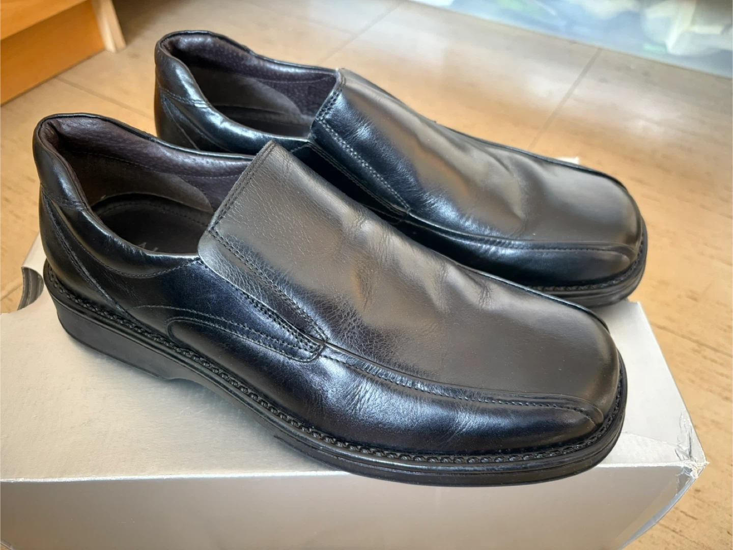 These are a pair of ALDO black leather loafers. They come with the original box. Great for a business casual look!
