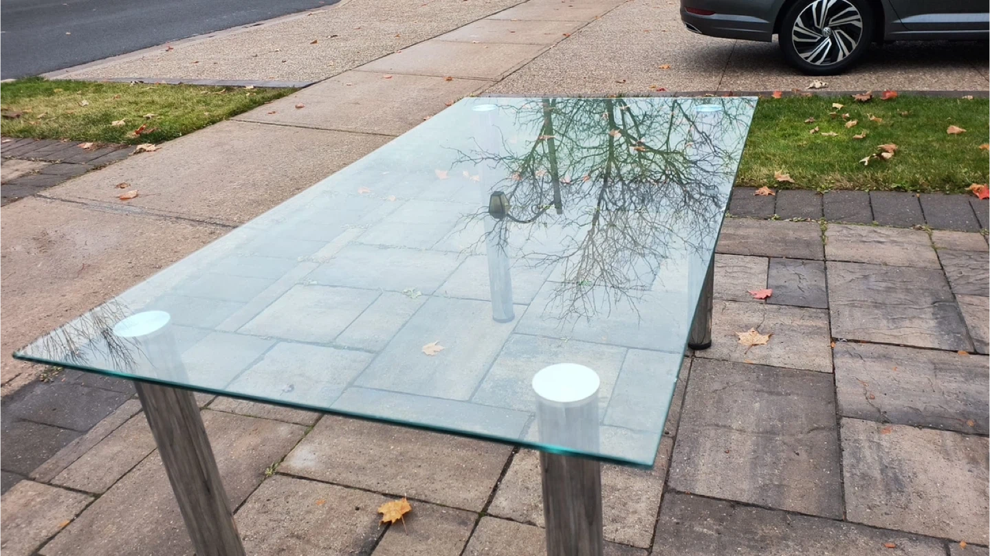 Selling a glass top dining table with silver legs. It's in good condition and would be perfect for a smaller dining space or kitchen nook. The glass is clear and the legs are sturdy