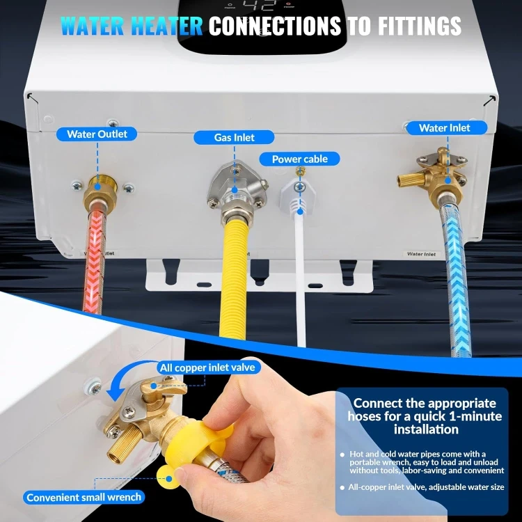 【Premium Quality & Durability】– Crafted with a stainless steel body for superior temperature and corrosion resistance, this propane water heater is built to last. The oxygen-free copper water tank ensures minimal heat loss and an extended service life. The LED smart digital display allows for easy temperature adjustments between 95°F and 149°F, giving you precise control over your hot water needs.