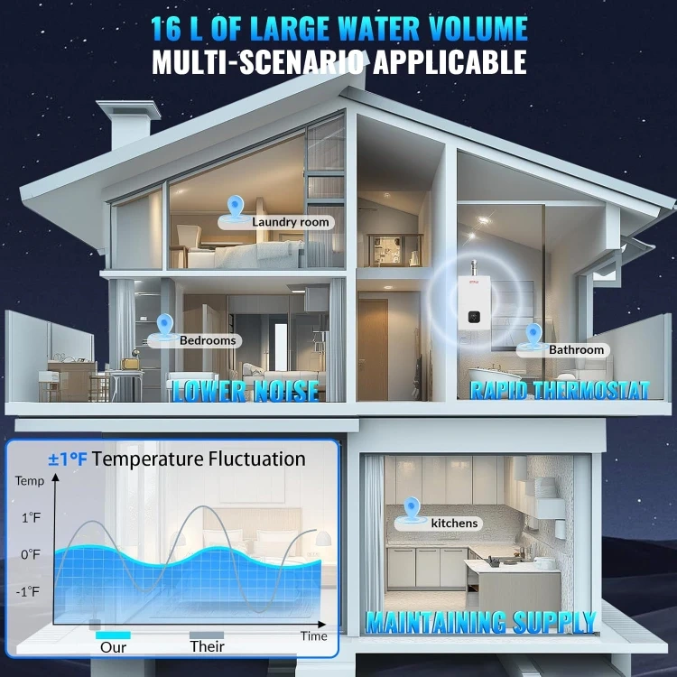 【Efficient & Energy-Saving】– With a high-performance output of 68,000 BTU per hour, this 4.21 GPM instant propane water heater provides on-demand hot water for 2–3 points of use simultaneously, making it ideal for bathrooms and kitchens. The advanced combustion technology minimizes gas consumption and reduces operational noise for a more efficient and quieter experience.