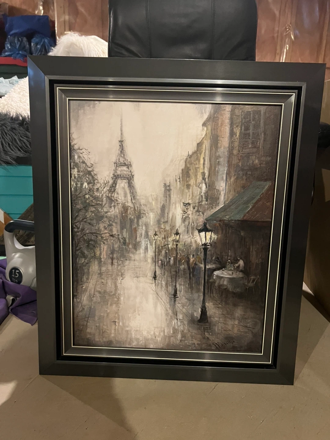 Here's a framed painting of a Paris street scene. It's a lovely piece that would add a touch of Parisian charm to any room