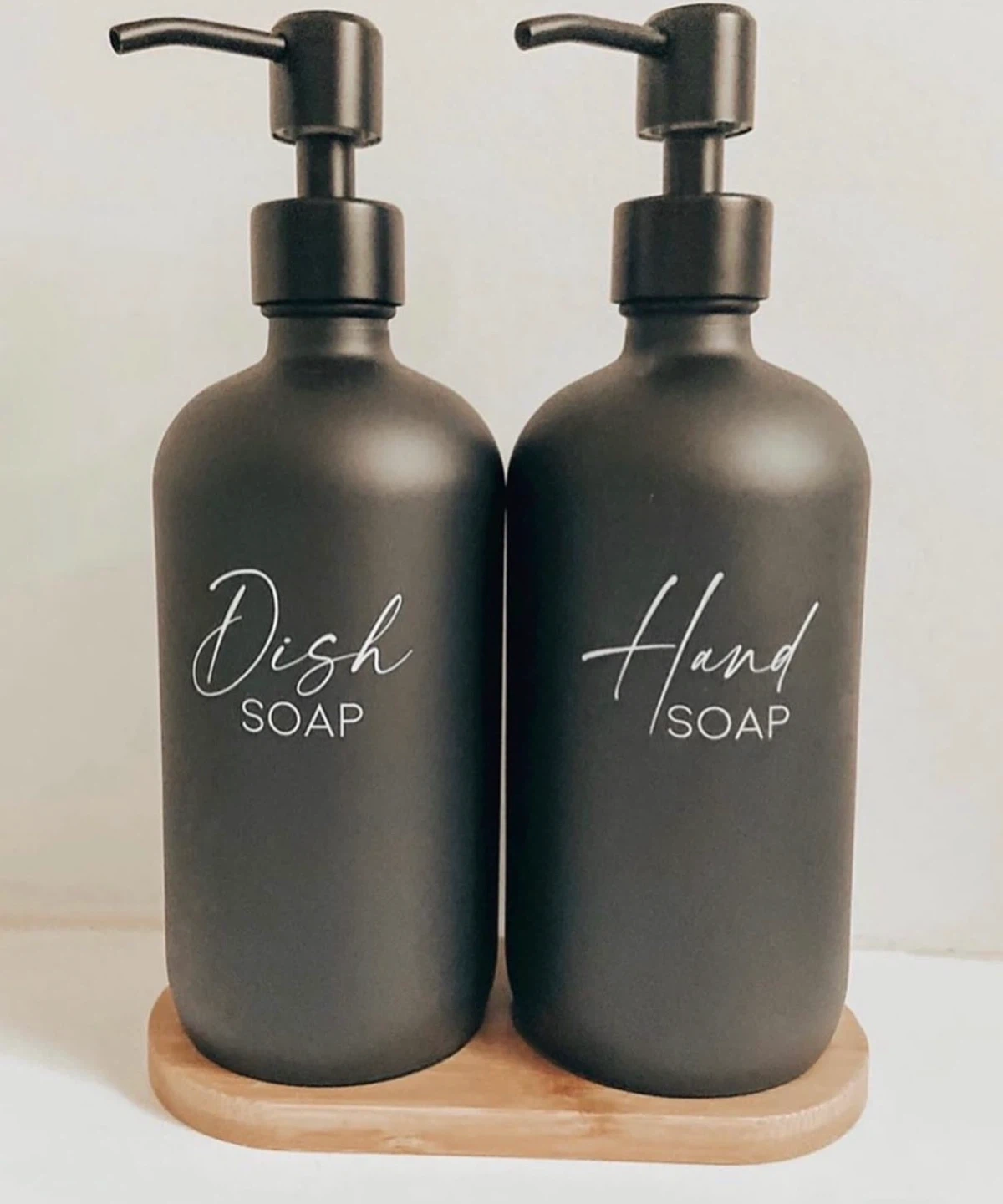 Selling a stylish set of matte black soap dispensers! One is labelled for dish soap and the other for hand soap. They come on a cute wooden base, perfect for adding a touch of modern farmhouse charm to your kitchen or bathroom. Contents not included. Multiple sets available.