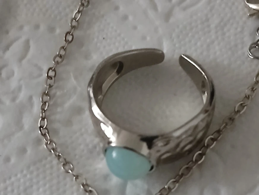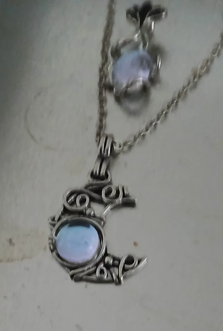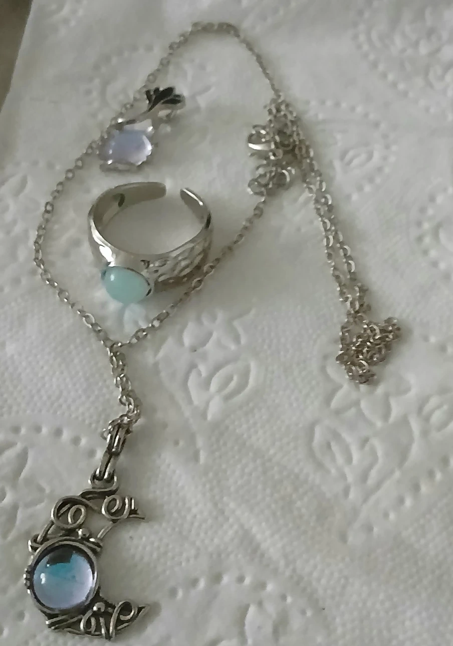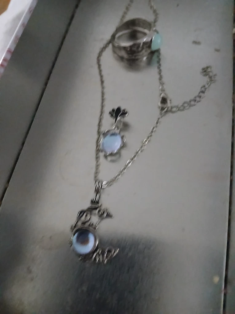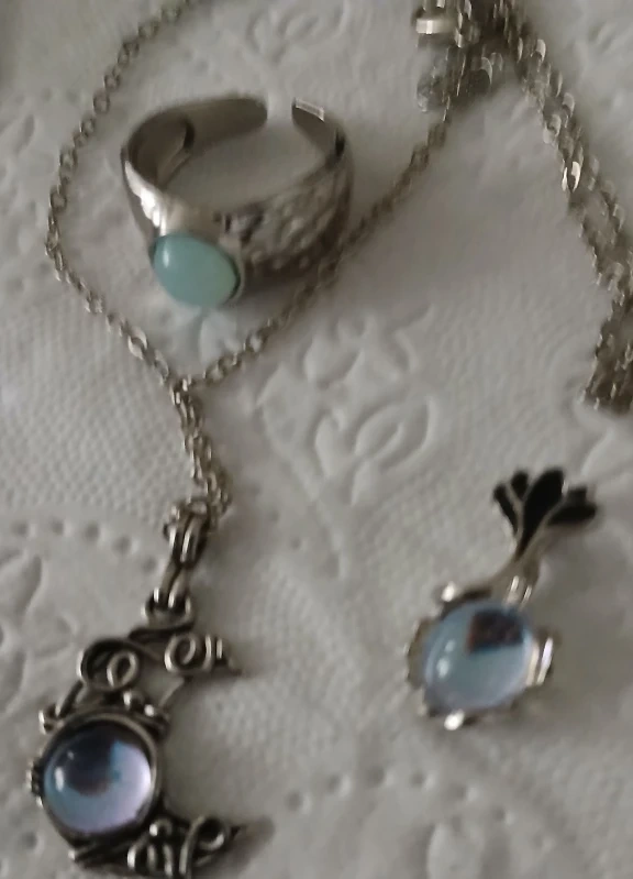 Selling a cute set of moonstone jewelry! Includes a necklace with a crescent moon pendant, a matching ring, and a small pendant. The metal is silver-toned and has a lovely, delicate design.