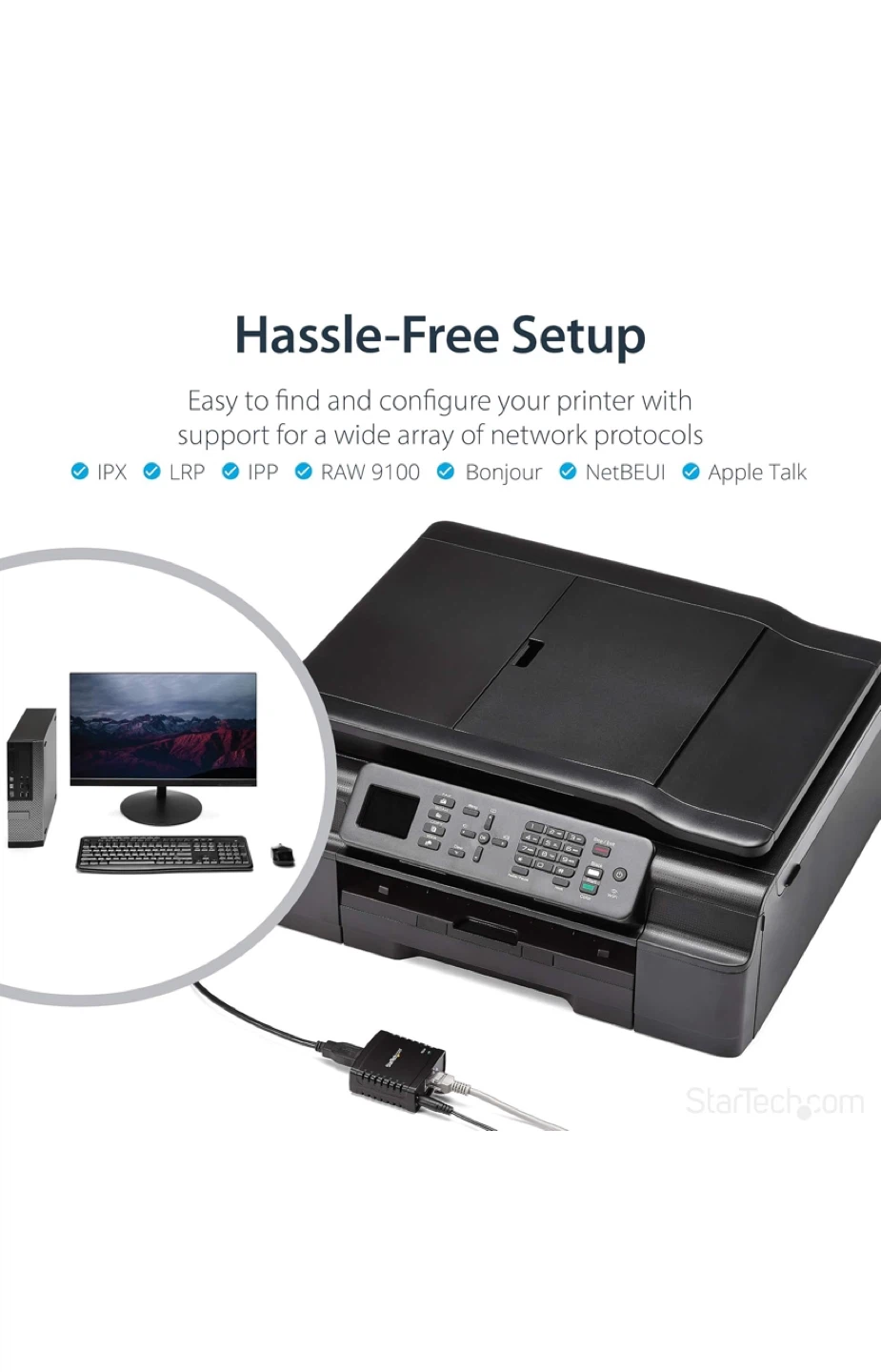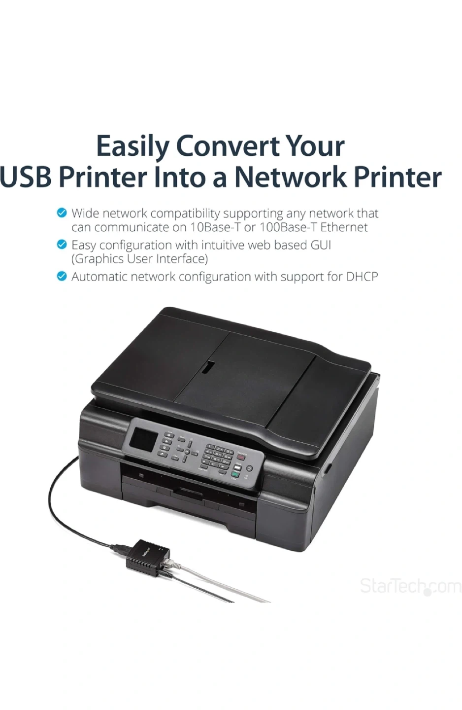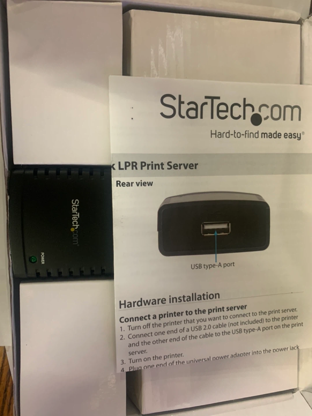 Selling a StarTech.com 10/100Mbps Ethernet to USB 2.0 Network LPR Print Server. It allows you to easily convert your USB printer into a network printer. It supports any network that can communicate on 10Base-T or 100Base-T Ethernet and has an easy configuration with an intuitive web-based GUI. Included in the box are the power adapter, network cable, and driver CD.