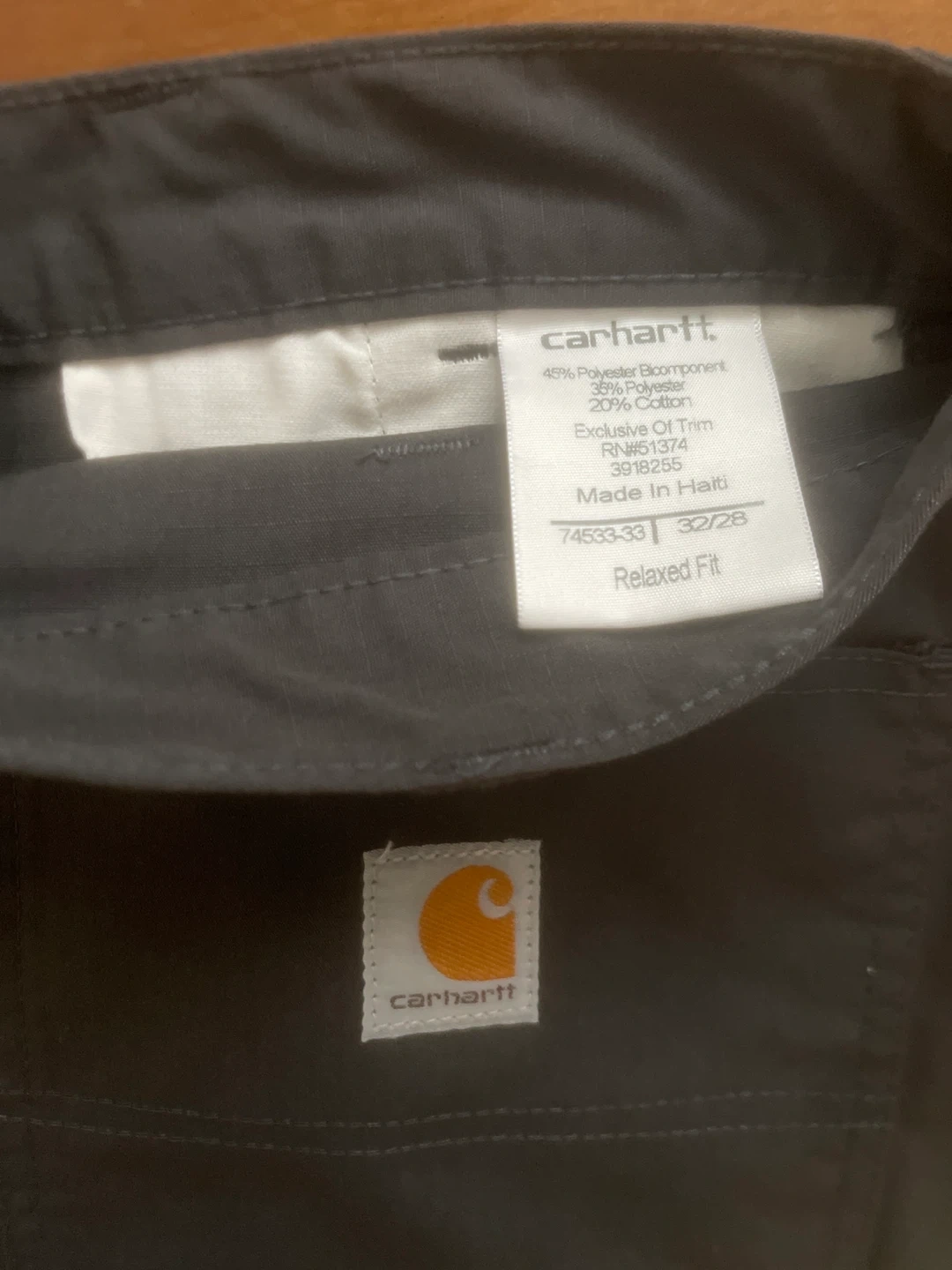 Selling a pair of Carhartt relaxed fit pants. They are size 32/28 and made of 45% polyester bicomponent, 35% polyester, and 20% cotton