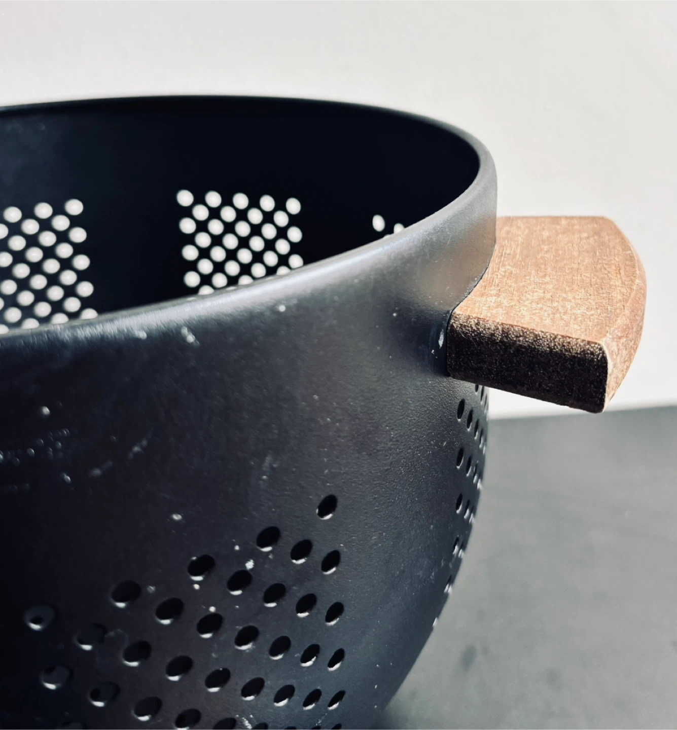 Metal Colander with Wood Handle and Stable Base, Powder Coated Steel Kitchen Strainer Basket for Draining Pasta, Vegetable and fruit(5.5quart,Matte Black)
