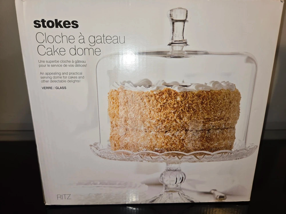 Selling a Stokes cake dome cloche! It's a glass cake stand with a dome cover, perfect for serving cakes and other delectable delights. It's an appealing and practical serving dome for cakes