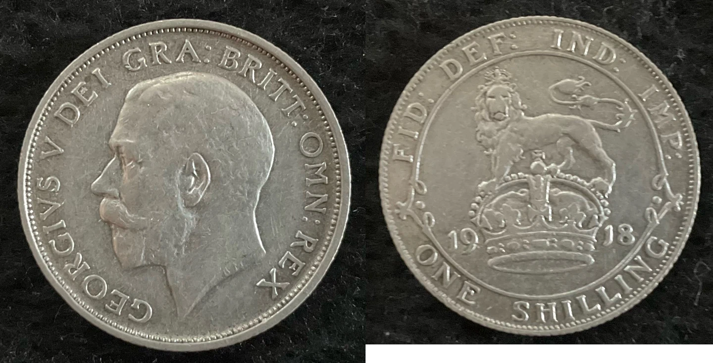 Selling a 1918 One Shilling coin. It features King George V on one side and a lion standing on a crown on the other. Great condition! Contains 92.5% silver.
