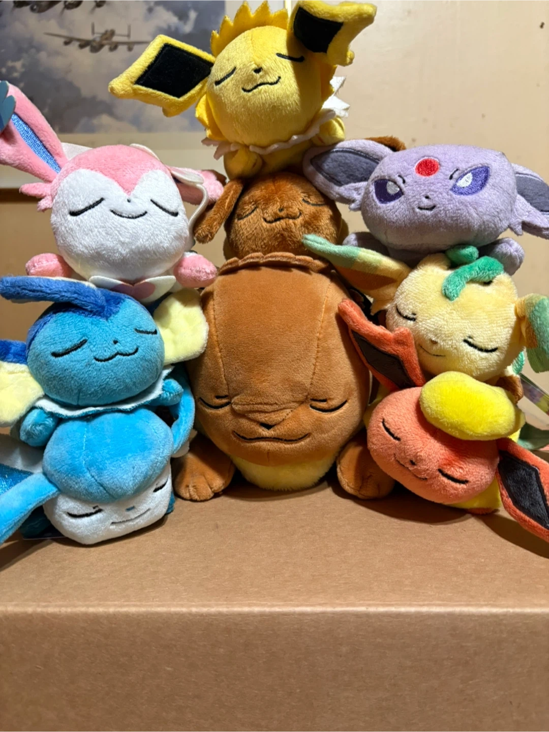 Selling a cute set of Eeveelution plushies! Includes Vaporeon, Jolteon, Sylveon, Espeon, Flareon, and Eevee. They're all in great condition, still tagged and ready for a new home