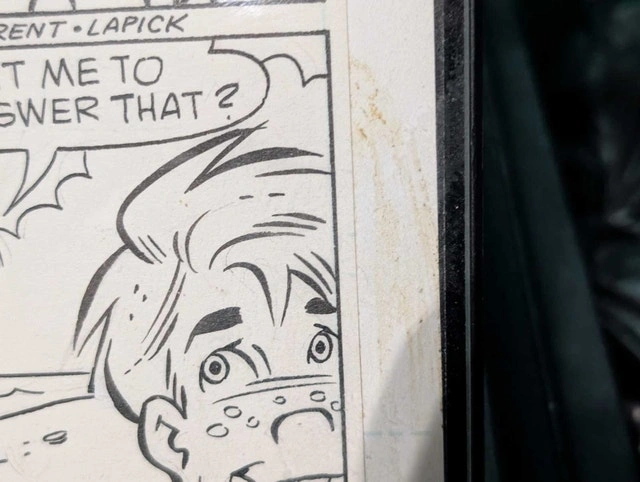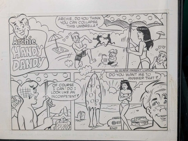 Own a piece of comic history with this original Archie comic art! This unique piece showcases the beloved characters in a fun, beach-themed scenario. While it's a used item, it's in good condition for its age, with some visible wear that adds to its vintage charm. It has a coffee stain underneath the art on the backing board, likely from one of the creators. a true gem for any comic enthusiast!