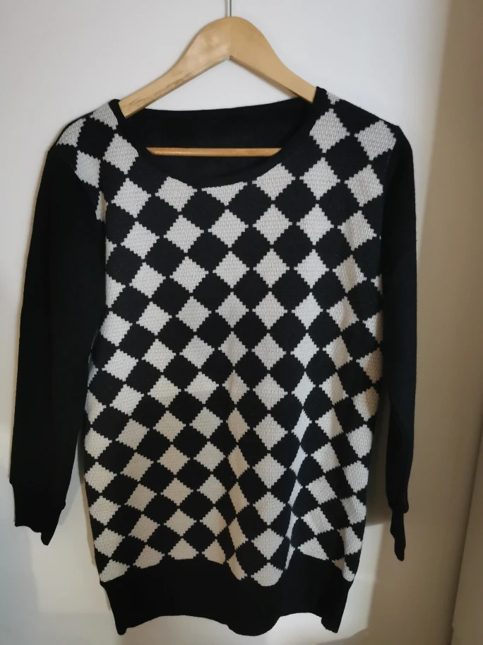 Here's a stylish black and white sweater with an argyle pattern! It's perfect for adding a touch of sophistication to your wardrobe. The sweater is in great condition and ready for a new home