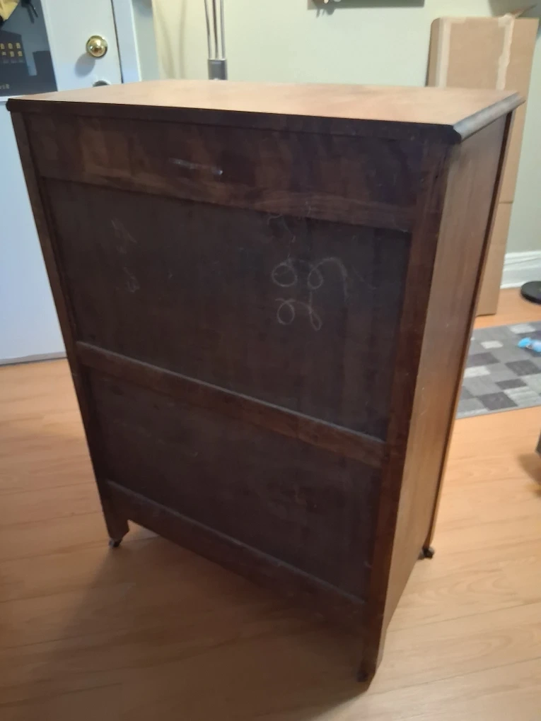 Selling a vintage wooden dresser with four drawers. It's got a lovely wood grain finish and brass-colored handles. One of the drawers has a pretty floral lining. It's a great piece for adding some character to your bedroom or living space!