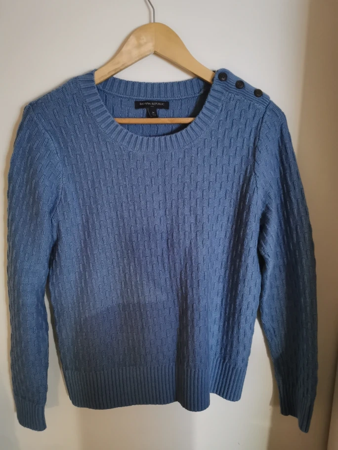 Cozy up in this lovely blue knit sweater from Banana Republic! It's a size medium and features a classic crew neck design with button details on the shoulder. Perfect for layering or wearing on its own for a casual, stylish look