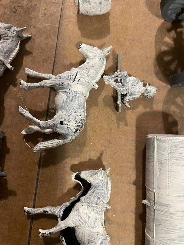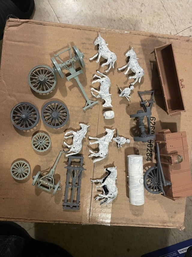 A rare and nostalgic 1970s Borax 20-Mule Team mail-away handcraft kit, complete with molded wagon parts, mule figures, wheels, and assorted assembly pieces. These kits were originally offered as a premium mail-order collectible tied to the iconic “20-Mule Team Borax” brand — a highly sought-after piece of Americana for collectors. Includes a mix of painted and unpainted parts, making it ideal for restoration, display, or diorama building. The original 1975 customs label is still on the box, adding to its authenticity and charm.