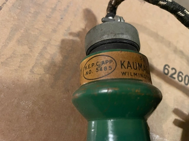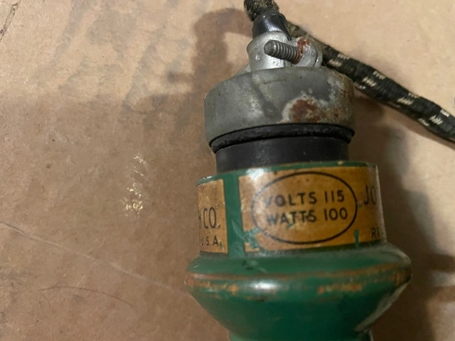 Classic mid-century electric branding/transfer iron manufactured by John A. Eberly Inc. (Reading, PA) and sold by Kaumagraph Co. (Wilmington, DE). Features the original green handle, iron heat head, and fabric-wrapped cord. A solid collectible for tool enthusiasts, industrial décor fans, or prop displays.