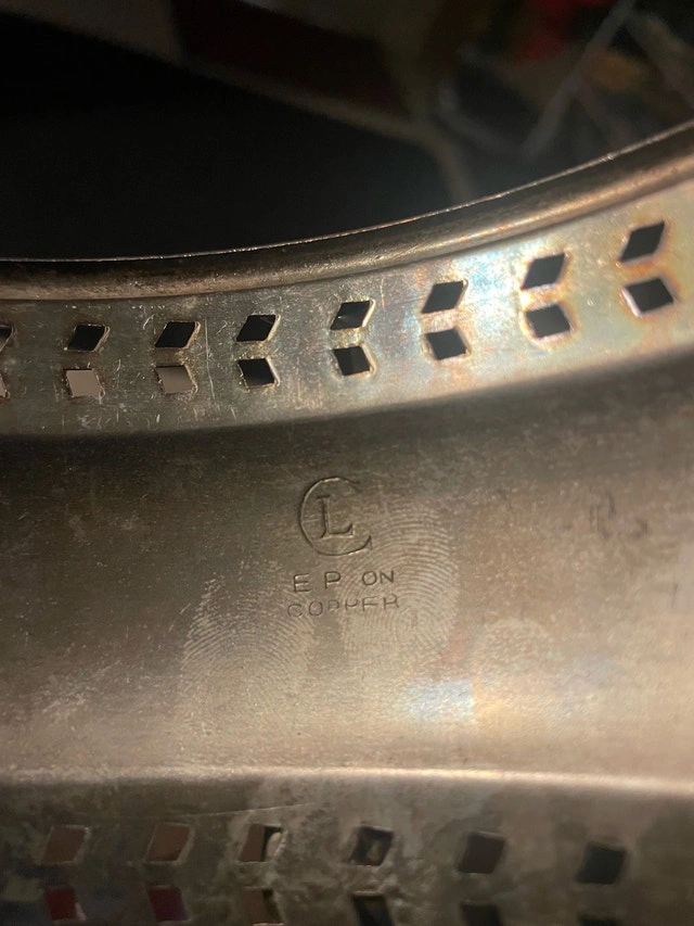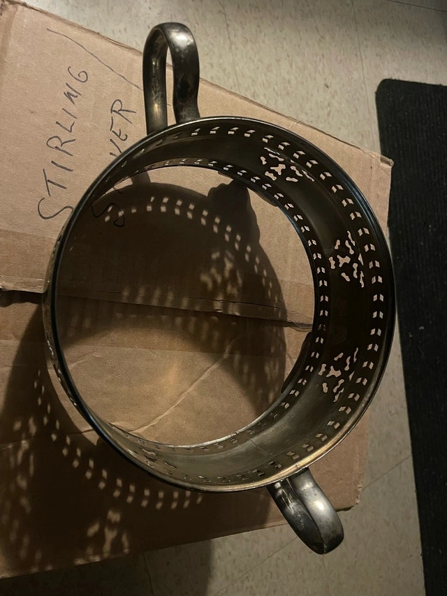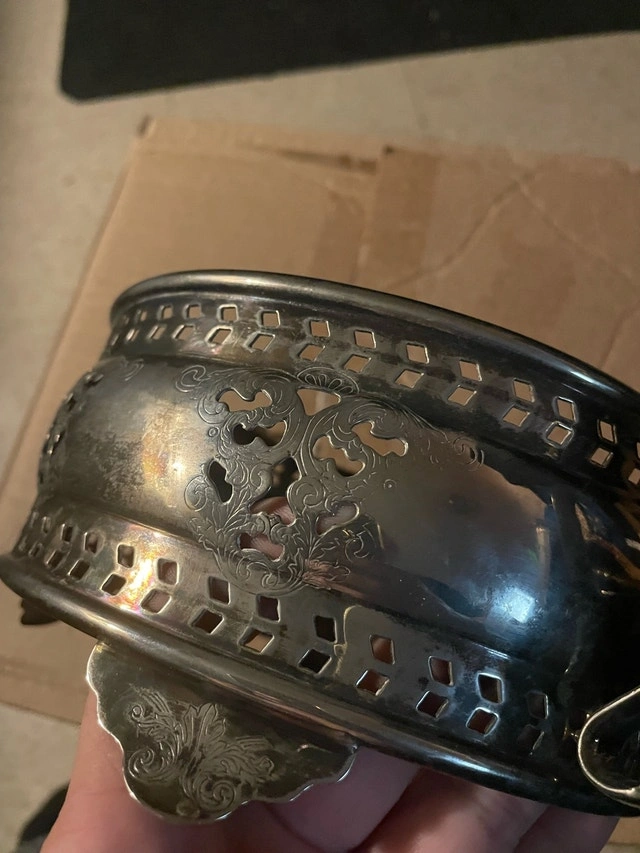 Add a touch of vintage charm to your home or dining table! Beautiful silver-plated (E.P. on copper) wine bottle holder featuring intricate cutwork and engraved detailing. It has a lovely aged patina that shows its character. ️ Vintage piece, likely early–mid 1900s ⚙️ Condition: One leg is missing (see photo) but it still stands and displays well Great for display, centerpiece decor, or repurposing For Sale By: Owner
