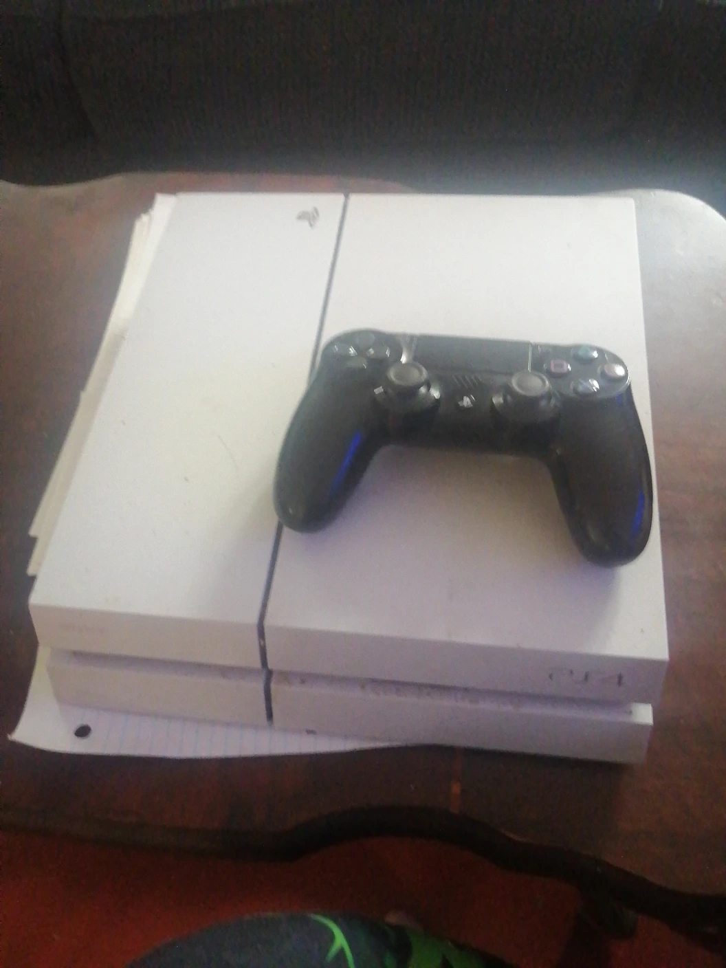 Selling a used PlayStation 4 in white. Includes a controller. It's in good working condition and ready for a new home!