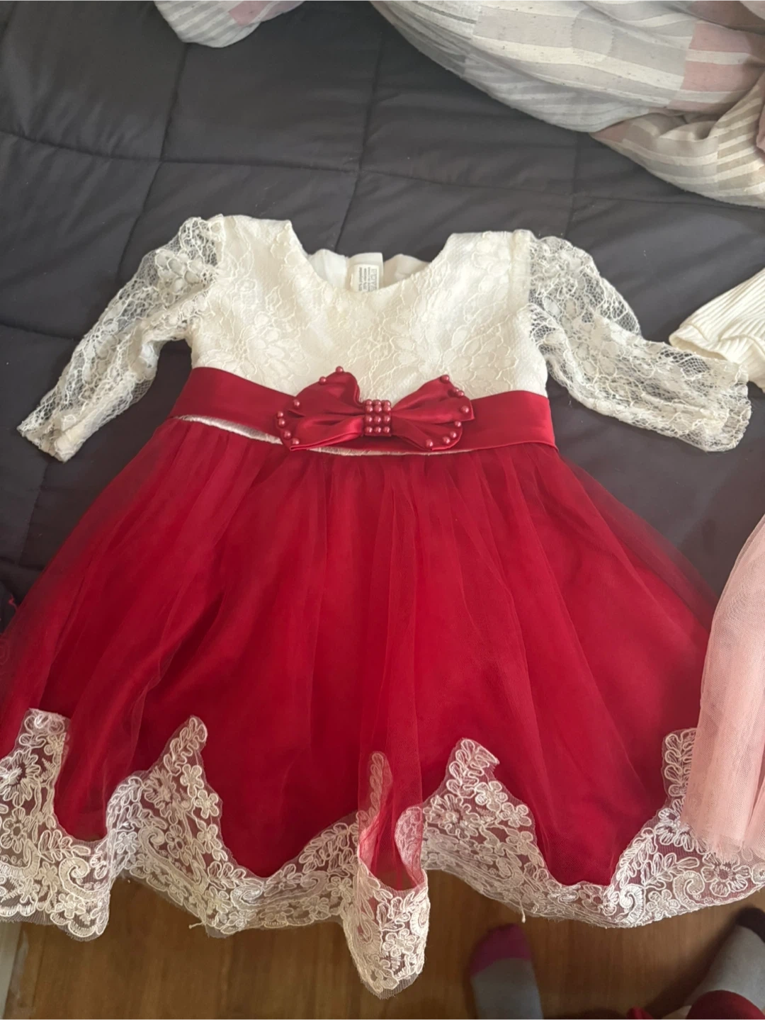 Two adorable dresses for your little girl! One is a beautiful red and white lace dress with a bow, and the other is a sweet pink dress with a tulle skirt. Perfect for parties or special occasions!