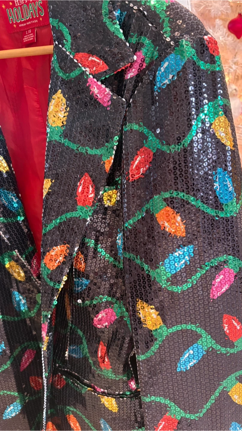 Add some sparkle to your wardrobe with this fun sequin blazer from Urban Heritage! It features a playful holiday light design and a vibrant red lining. Size L/G.