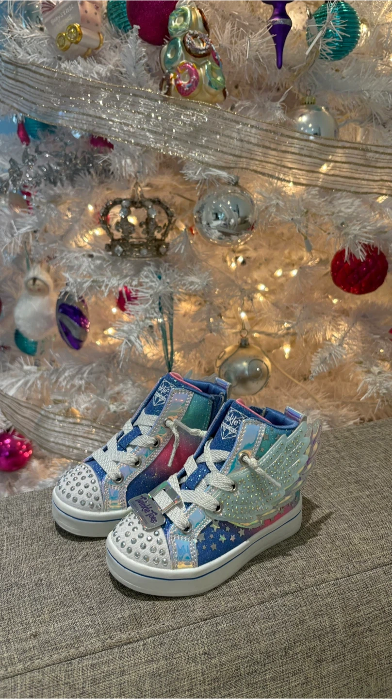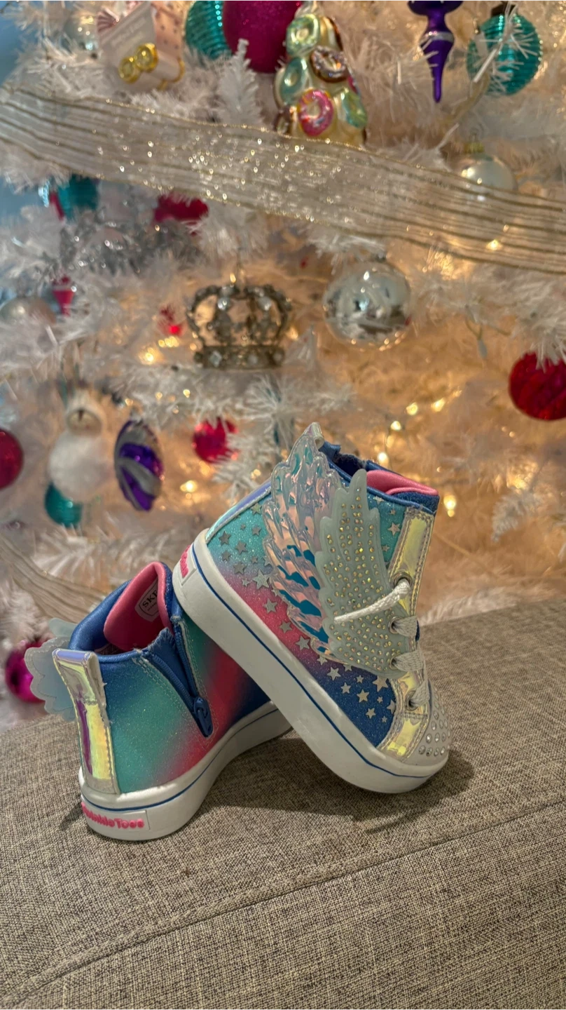These adorable Skechers Twinkle Toes hi-tops feature a fun winged design and are in great condition! They're a size 22 and perfect for adding some sparkle to any outfit.