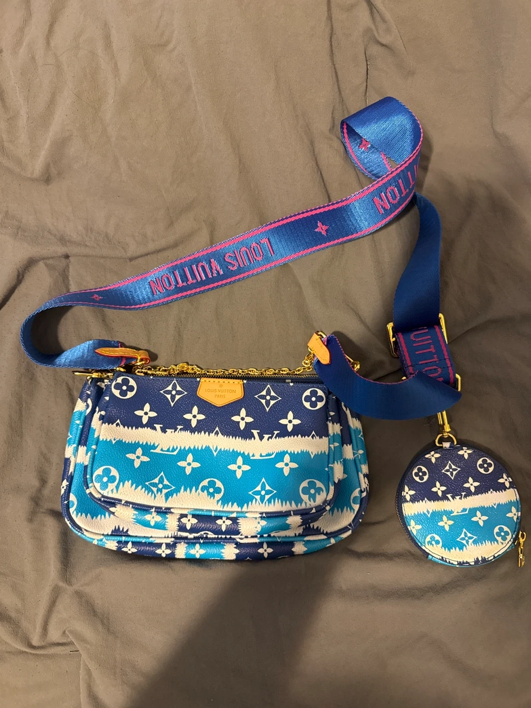 This Multi Pochette Accessories purse is in great condition! It features a blue and white monogram pattern, a detachable round coin purse, and a detachable strap. Perfect for adding a pop of colour to any outfit!