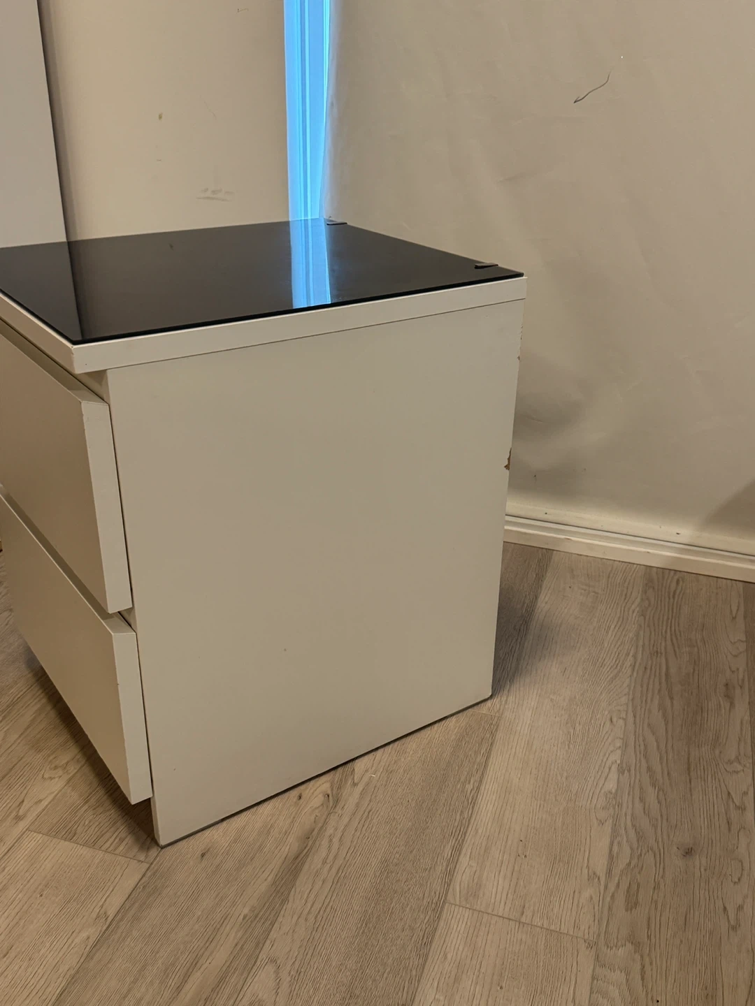 Selling a bedside table with a white frame and a sleek black glass top. It has two drawers for storage. There are some signs of wear on the side, as shown in the pictures.