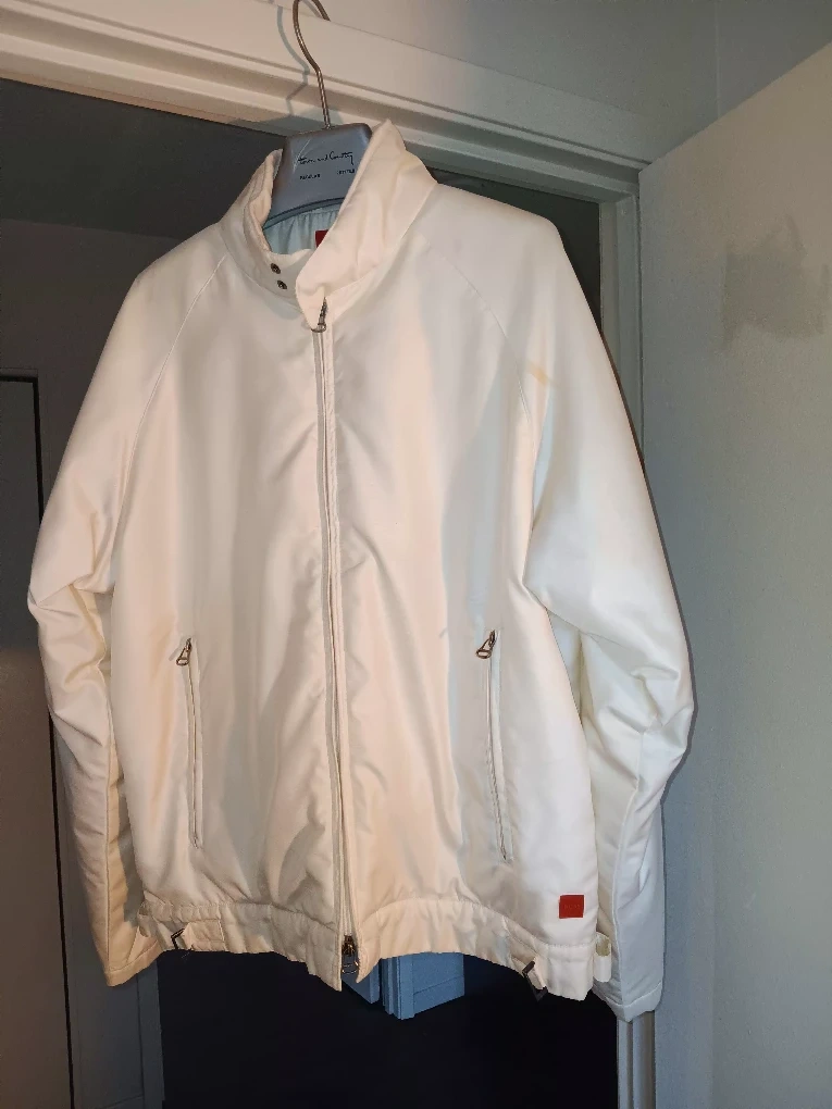 Here's a Hugo Boss jacket with fleece lining in a lovely off white colour! It's in great condition and ready for a new home. Perfect for adding a touch of style to your wardrobe!