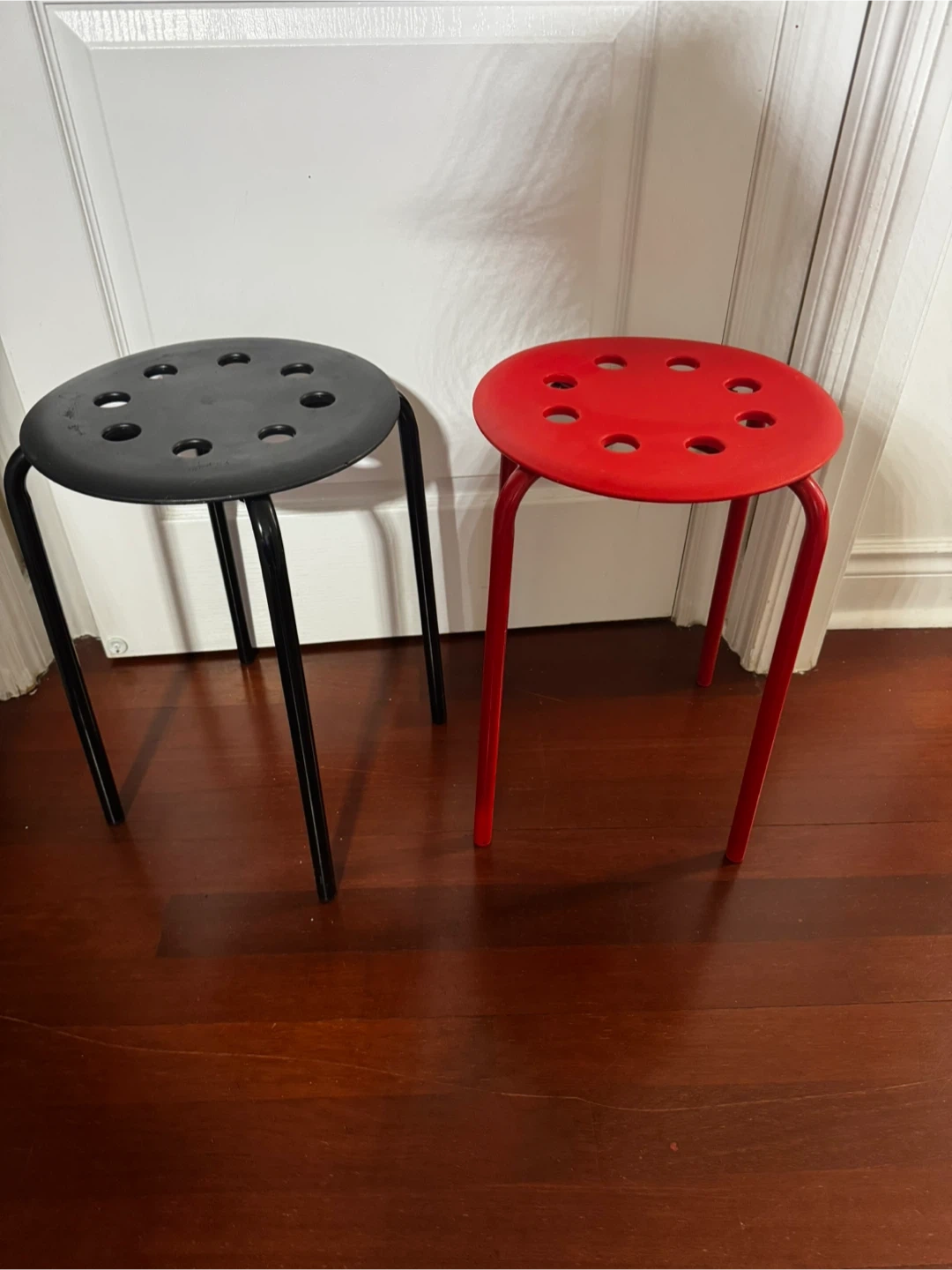 Two IKEA Marius stools for sale! One is red and the other is black. They're lightweight and easy to move around, perfect for extra seating.