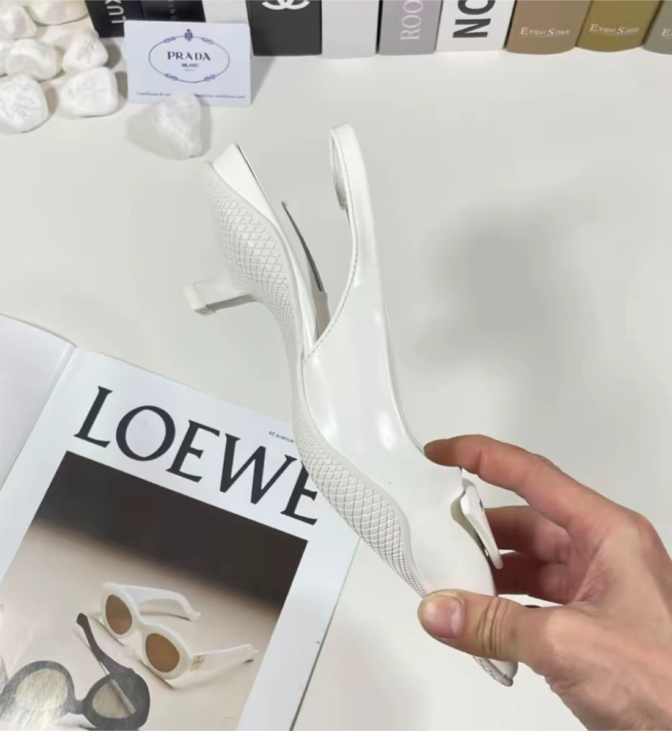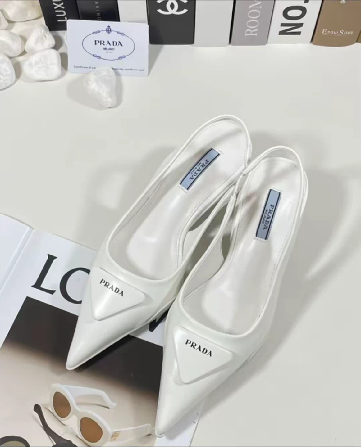 Selling a pair of stylish Prada slingback heels in white. These heels feature the iconic Prada logo and have a sleek, modern design. They are in great condition and ready for a new home!