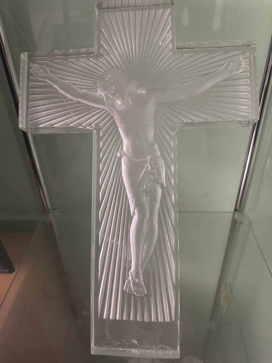 Rene Lalique Statue Christ: 16 inch total high glass cross depicting Jesus Christ on wood base Lalique Plaque. Lot 150 Est:
