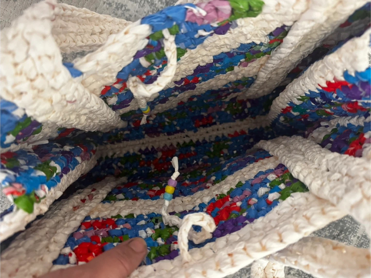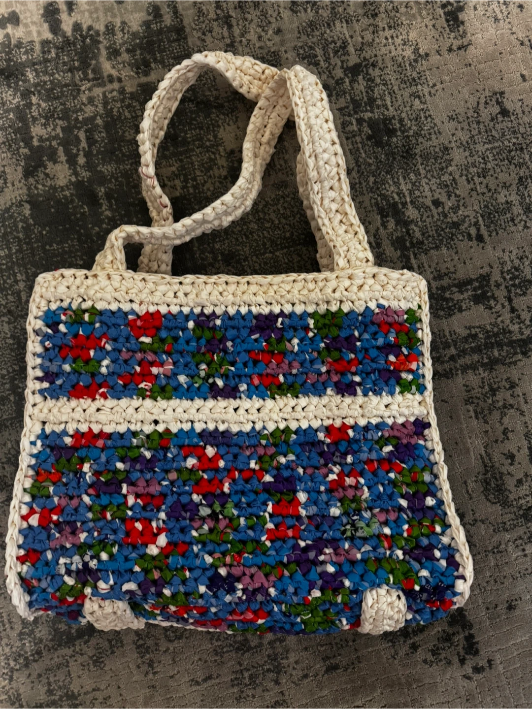Check out this charming handmade woven tote bag! It features a unique design with colourful accents, perfect for adding a touch of whimsy to your outfit. The bag is sturdy and well-crafted, making it ideal for everyday use.