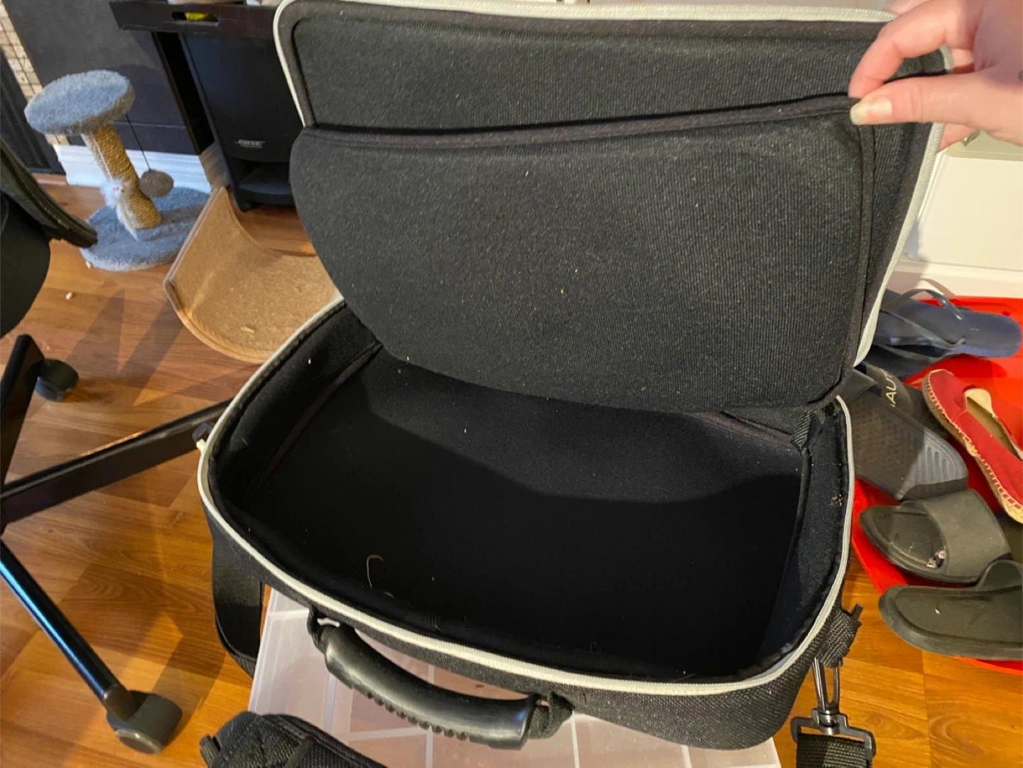 Selling a black laptop case that comes with a shoulder strap. It features a handle for easy carrying and a zippered closure to keep your items secure. It appears to be in good condition and ready for a new home