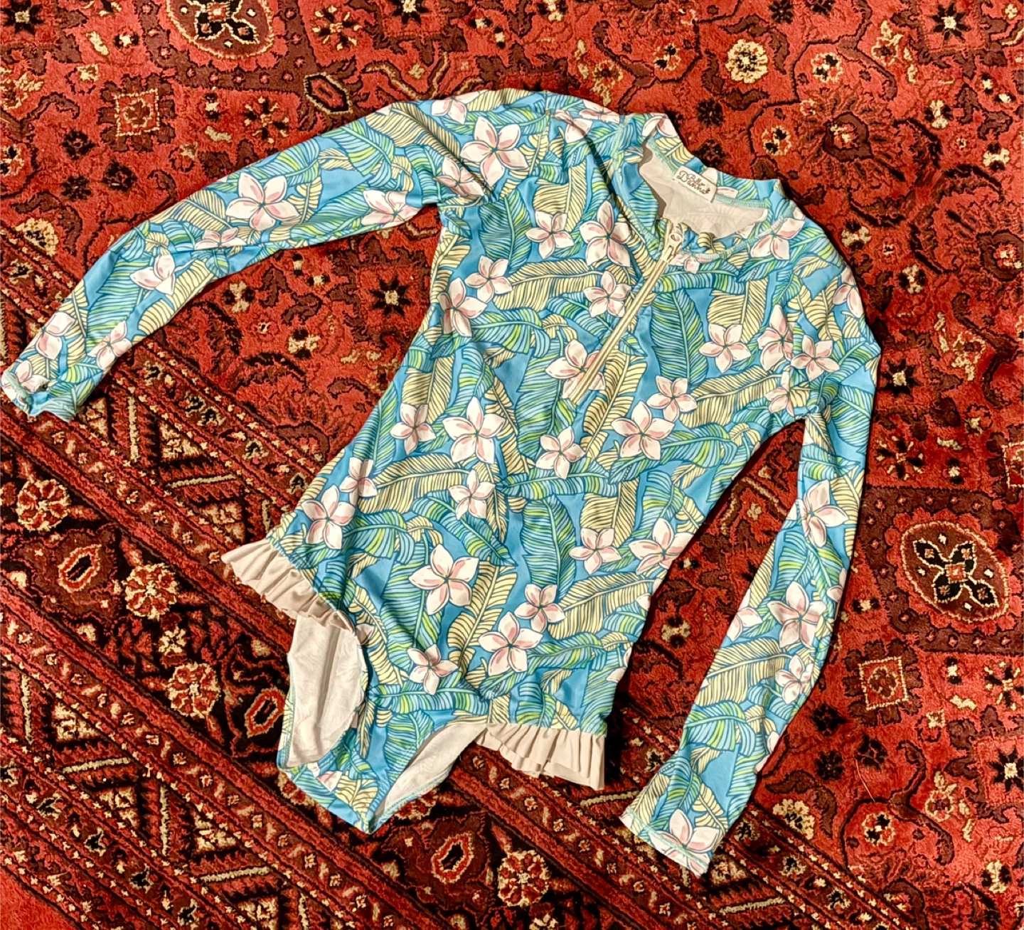 This adorable Lime Ricki swimsuit features a vibrant floral pattern and long sleeves for extra sun protection! It's in great condition and ready for some fun in the sun