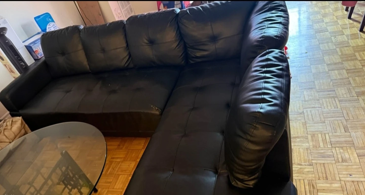 Selling a black leather sectional sofa. It's in good condition and would be a great addition to any living room. It has a modern look and is very comfortable for lounging and relaxing