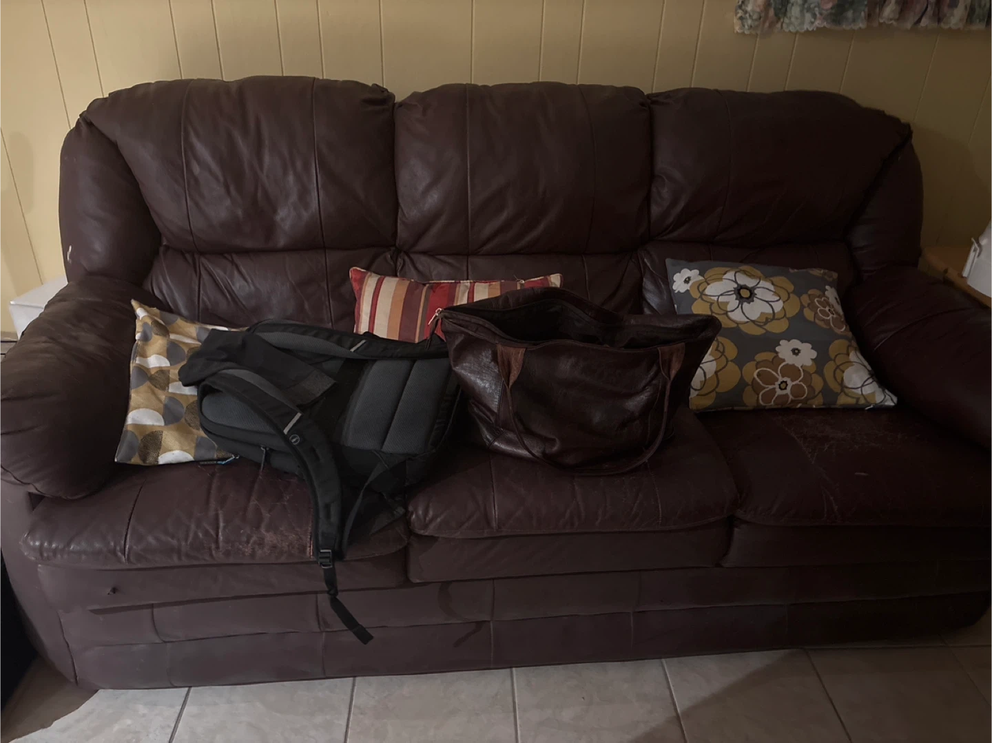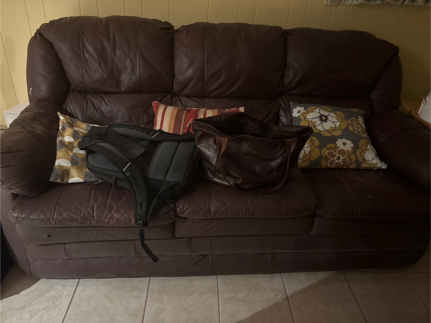 Here is a brown leather sofa. It is a three-seater sofa in used condition. The material is leather. It has some wear and tear. It is a great sofa for a living room or family room