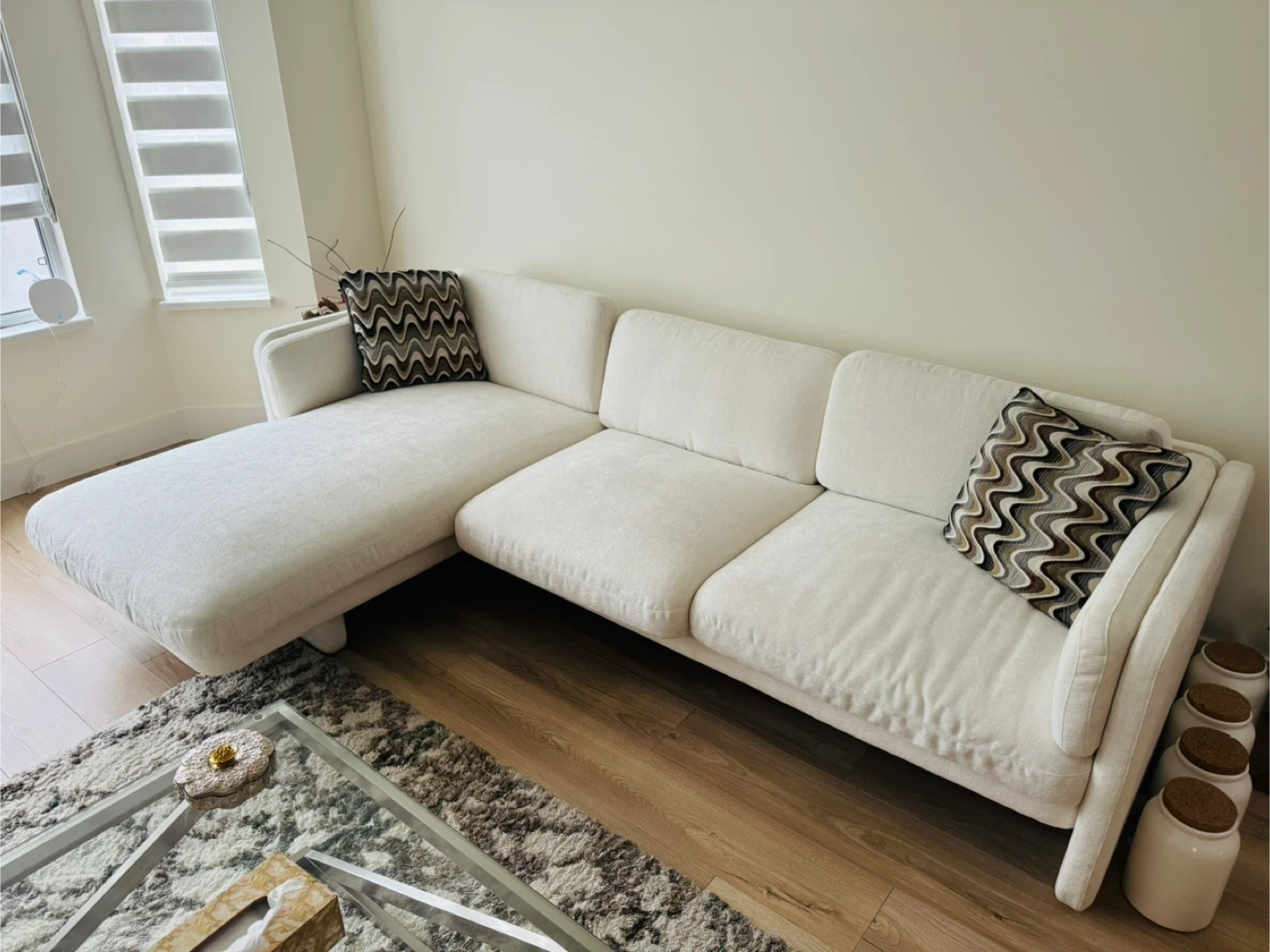 Selling a Design Within Reach sectional sofa. It's in great condition and features a stylish, modern design. The sofa is a beautiful white colour and would be a great addition to any living space!