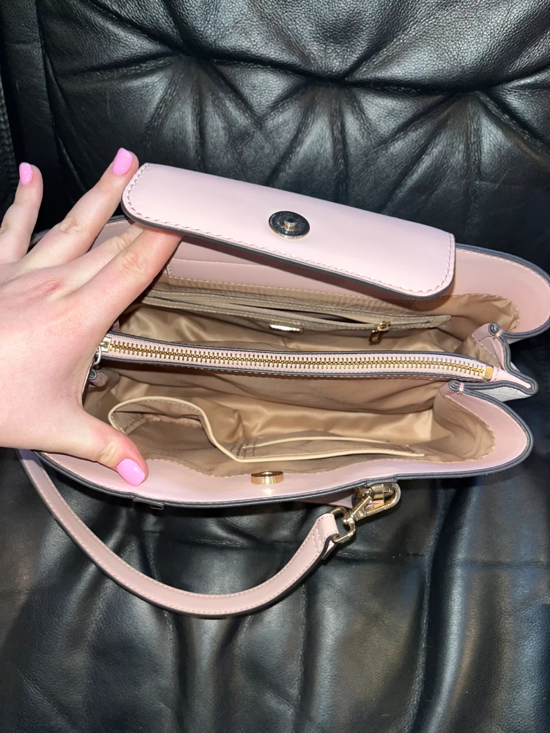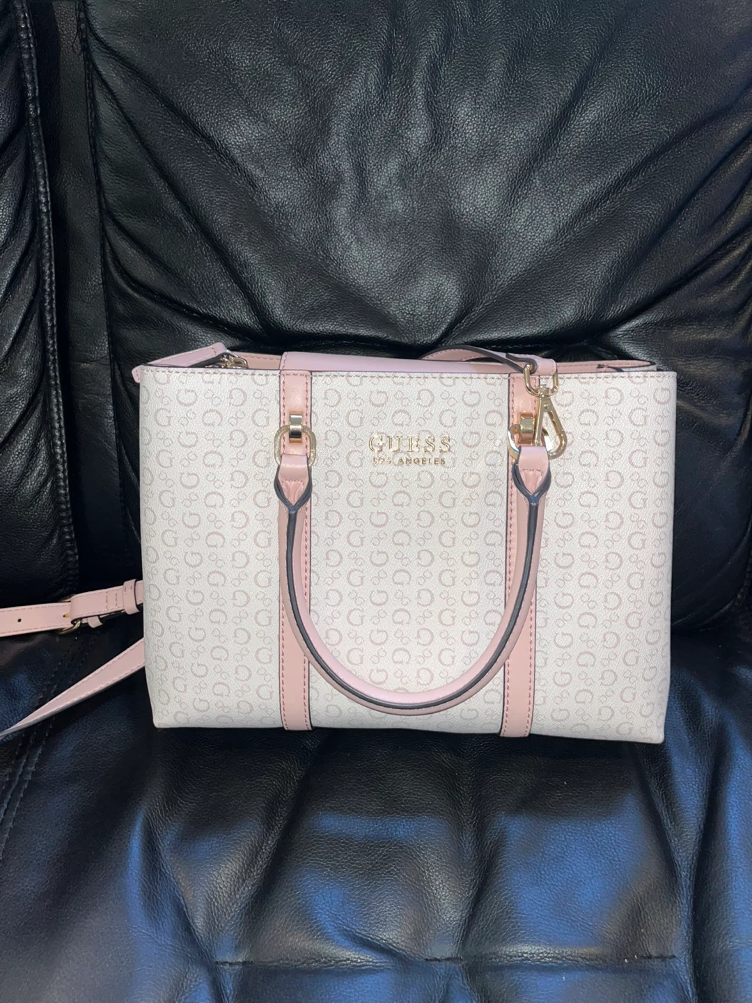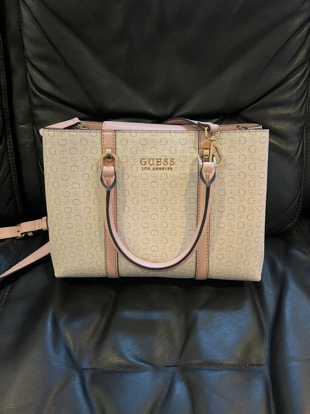 Selling a cute Guess satchel bag! It features a cream-colored body with a subtle 'G' logo pattern and pink accents. It's a stylish and practical bag for everyday use. The interior has multiple compartments to keep your belongings organized