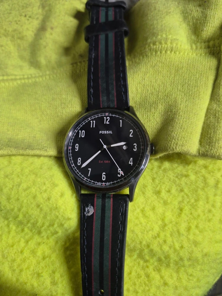 Selling a Fossil watch with a black face and a stylish black leather strap featuring green and red stripes. There is some wear on the strap, as shown in the photos, but it's still a great-looking timepiece!