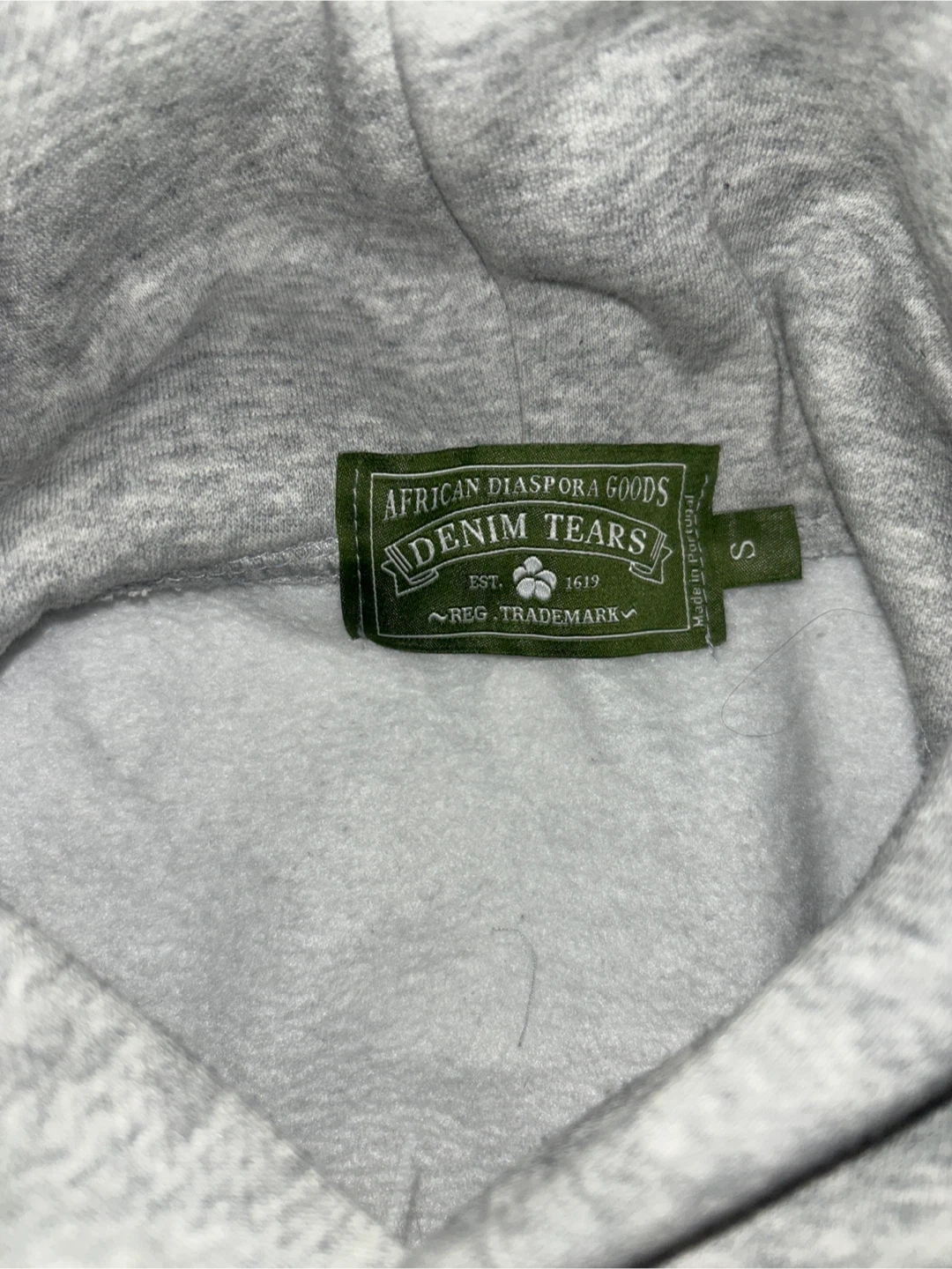 Selling a Denim Tears hoodie in size small. It's a grey hoodie with a white floral design. The tag indicates it's from African Diaspora Goods. It's in great condition and ready for a new home! Great for a Christmas gift.