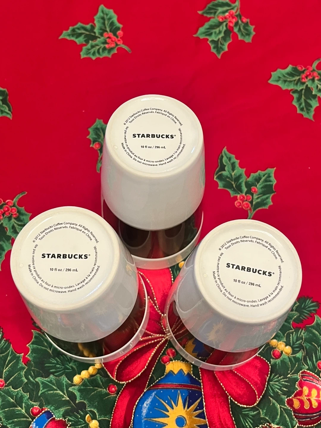 Selling a set of three Starbucks tumblers! They're white with a copper-coloured band around the middle. Each tumbler holds 8oz, perfect for your morning coffee or tea!