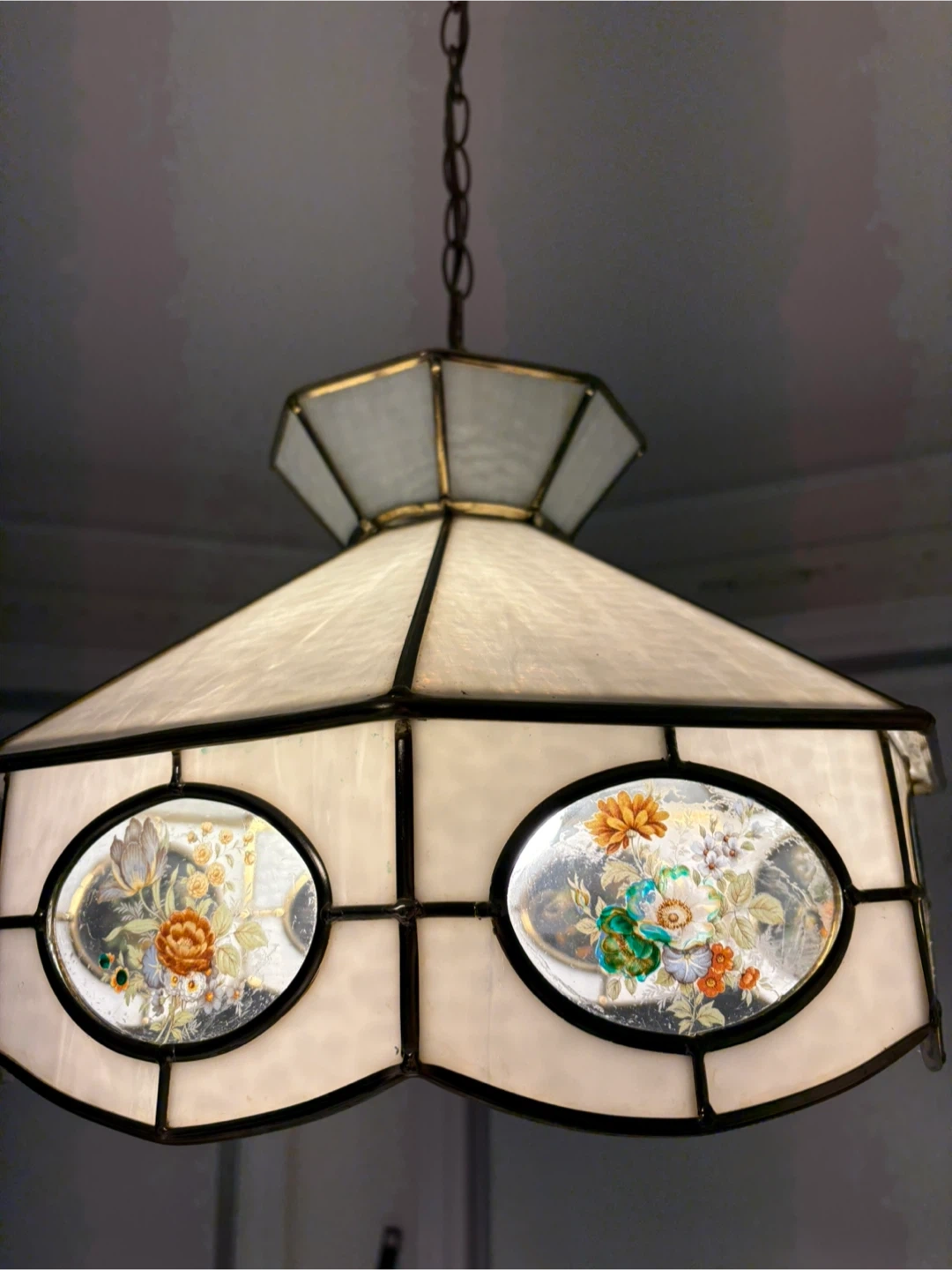 Selling a vintage hanging lamp with a beautiful floral stained glass design. It adds a warm and cozy touch to any room. The lamp is in great condition and ready to brighten up your space!