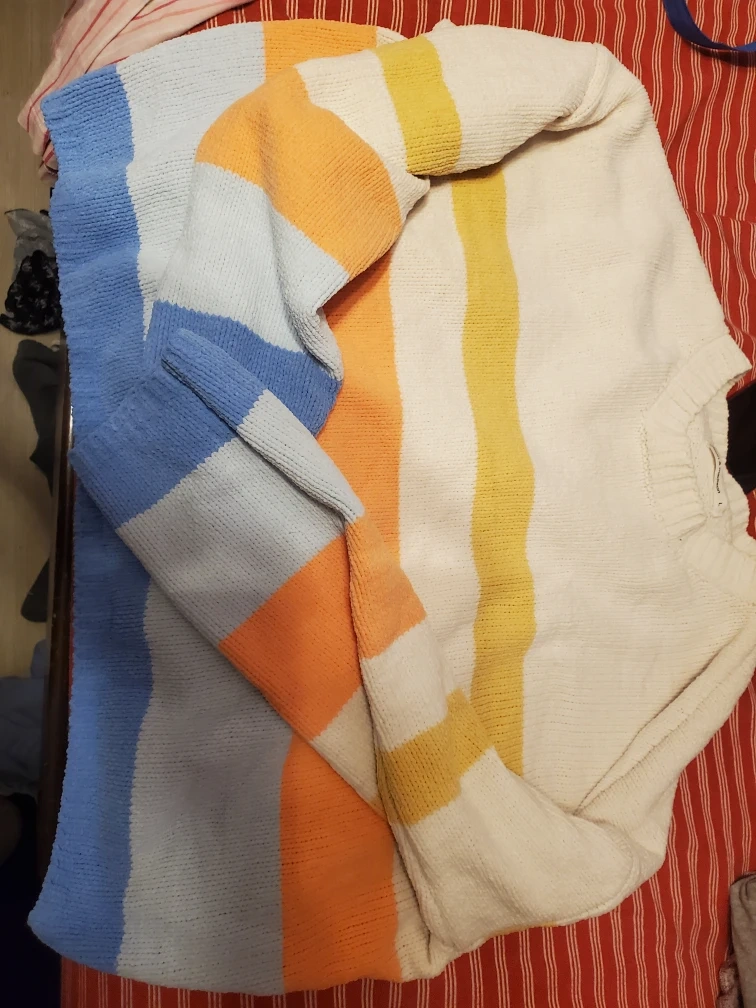 Here's a cozy striped knit sweater! It features a colourful design with stripes of blue, orange, yellow, and white. Perfect for adding a pop of colour to your wardrobe and staying warm on chilly days