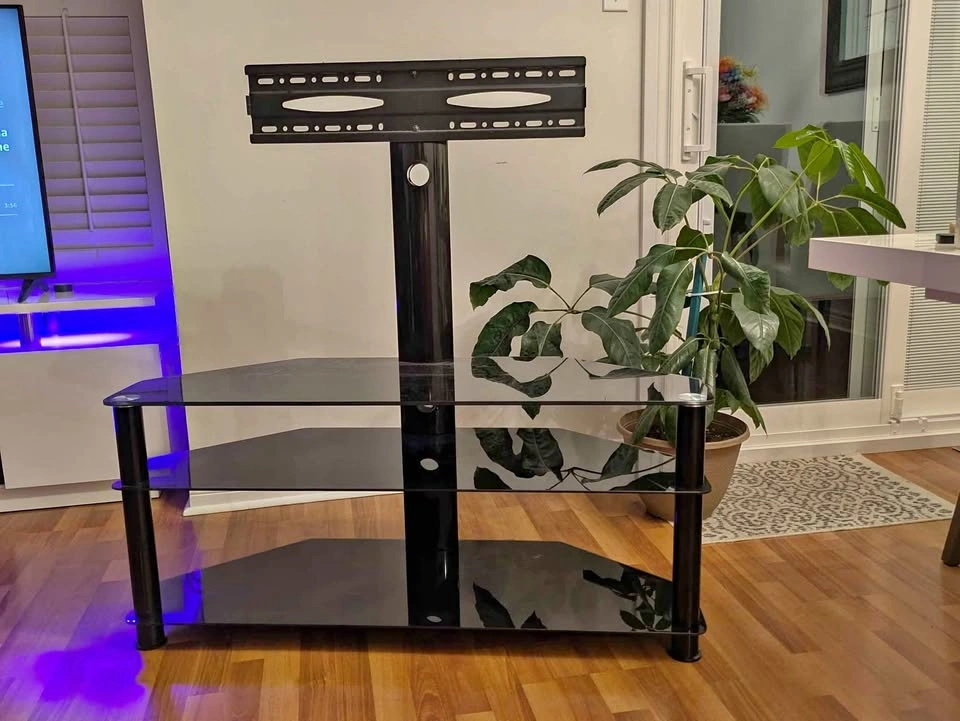 Corner TV stand with 3 black glass shelves and a cable manager on the back. The TV can also turn left and right when on the stand. Height adjustable. Will hold TV's from 32 to 75 inch.