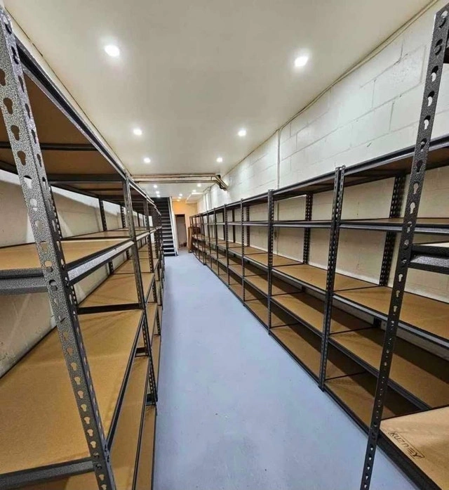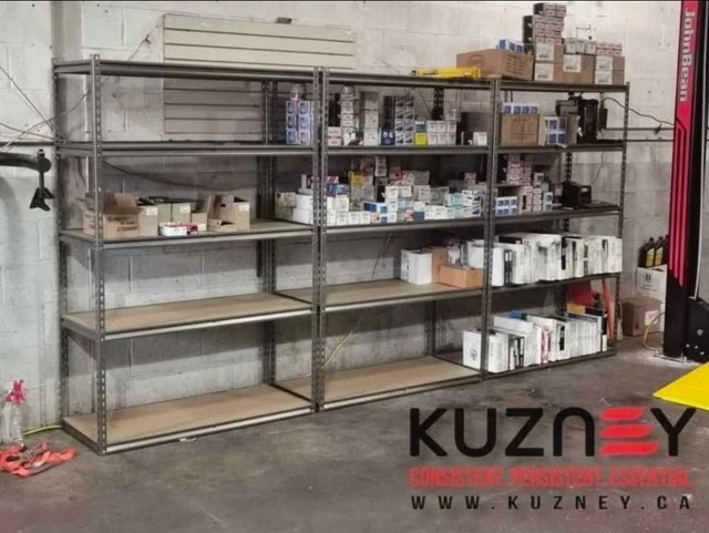 Brand new in box Muscle Rack heavy duty steel shelf units. Other sizes also available. Dimensions: 72" High (6 feet) x 48" Wide (4 feet) x 20" Deep (1.6 feet+). 121 cm width x 51 cm depth x 183 cm height. Brand new unassembled in packaging, clip-ins with easy installation. $100 each. We have 5-tier shelving units available in Mississauga (dixie / matheson) and Oakville (neyagawa / dundas). Each shelf holds a weight capacity of 300+ lbs. Made of galvanized steel beams with engineered wood boards in silver vein and black dots colour. Package dimensions: 6.5cm High x 51cm Wide x 121cm Long. Up to 1500 lbs + capacity total. Adjustable shelves, complete boltless system. Easy to adjust and relocate. Ideal storage solution for a wide range of industrial and commercial applications.