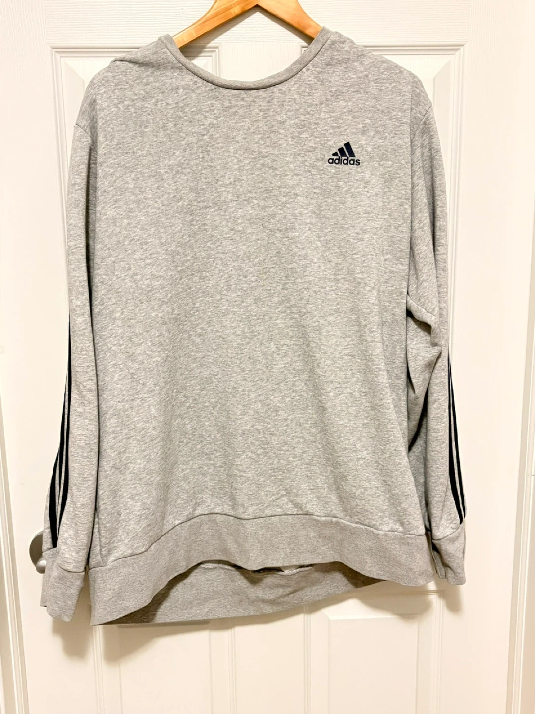 Selling a comfy grey Adidas sweatshirt! It features the classic three stripes on the sleeves and the Adidas logo on the chest. Perfect for casual wear or workouts!