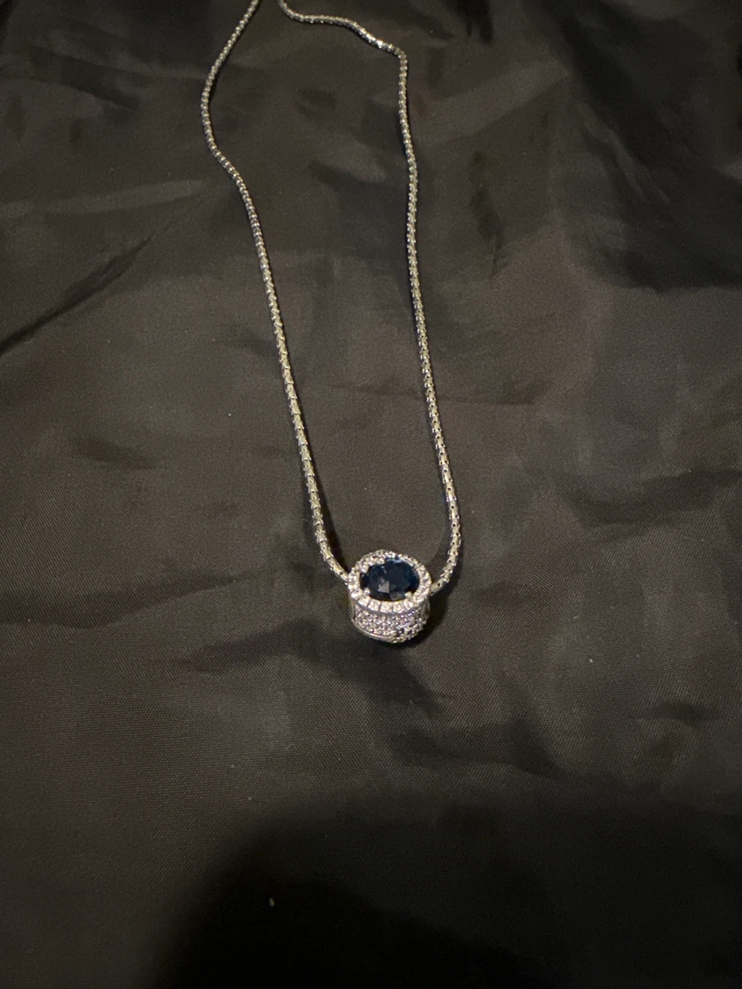 A lovely necklace featuring a blue stone surrounded by smaller clear stones. The chain is a delicate silver colour. It's in great condition and ready to add a touch of elegance to any outfit
