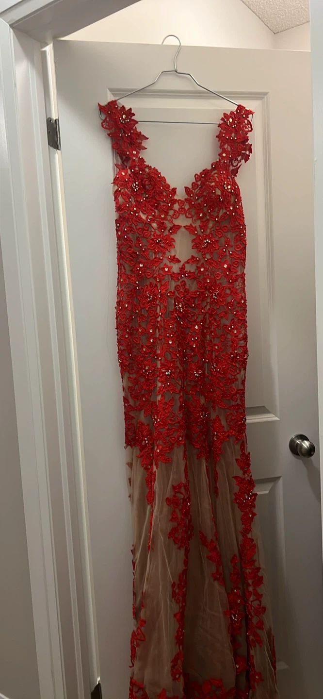 Beautiful red lace formal dress, perfect for a special occasion! It has a lovely, detailed design with intricate lace and beading. It's in great condition and ready to make someone feel fabulous